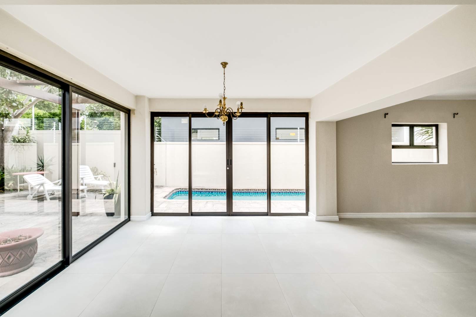 Living rooms, all recently renovated with modern tiled flooring throughout, consist of a contemporary open plan layout between the kitchen, dining room and lounge all opening out through aluminium sliding doors to the paved garden, patio and pool area with a gas fireplace – a prerequisite in Cape Town. The kitchen offers granite counter tops with a centre island, double sink, newly installed gas hob and electric oven with plumbing for 1 appliance. The laundry room is located off the guest suite with space for 2 appliances.