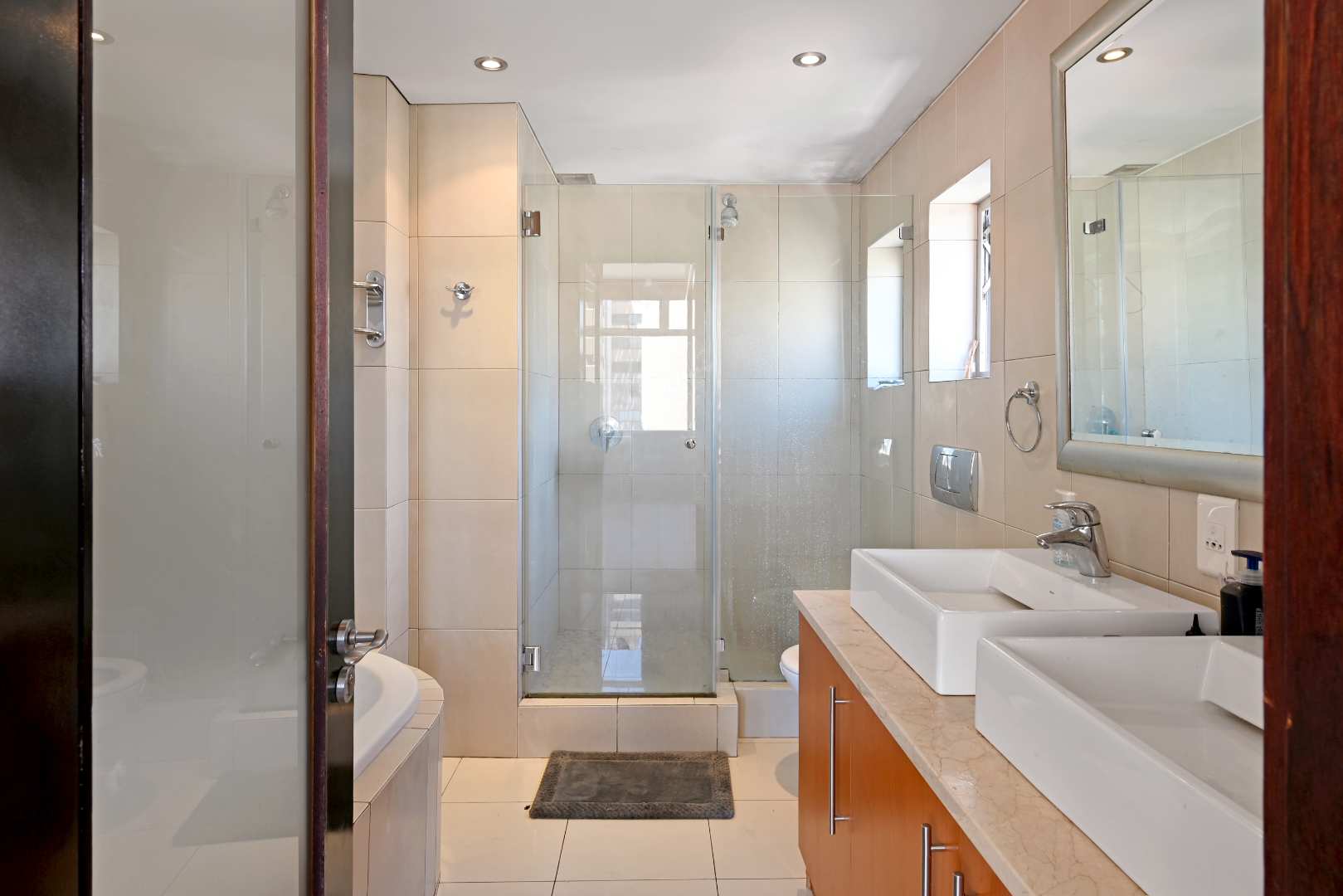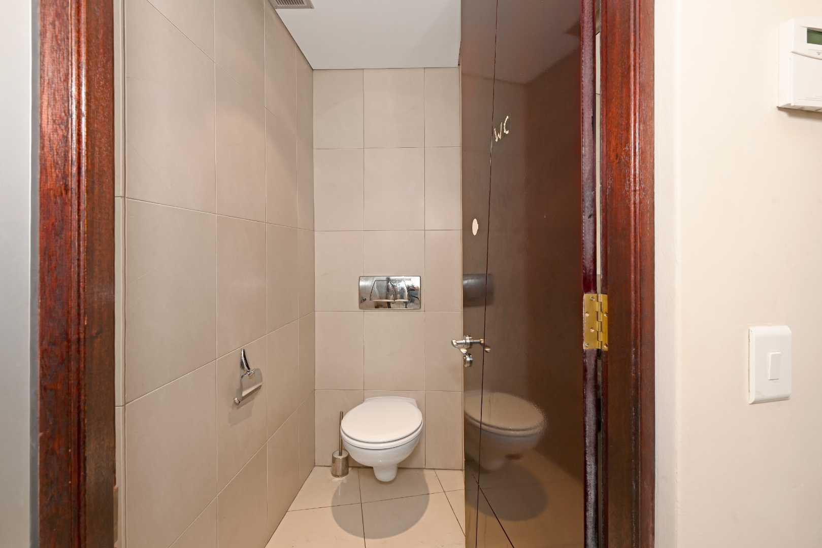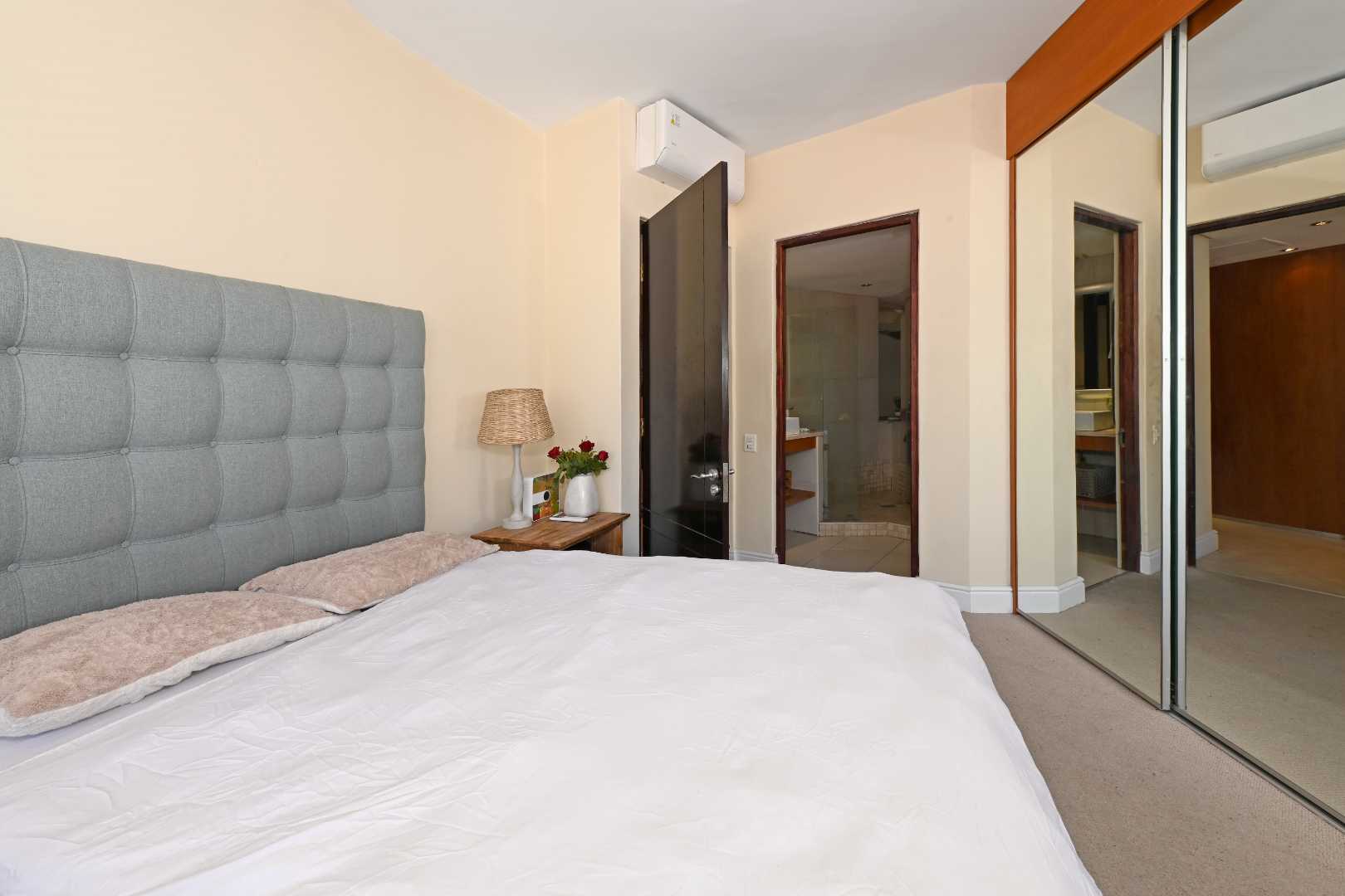 Both bedrooms serve as tranquil sanctuaries, featuring generous closet space, air conditioning, and abundant natural light. Each en-suite bathroom is elegantly designed with a shower, bathtub, and heated towel rails, while a guest cloakroom adds further convenience.