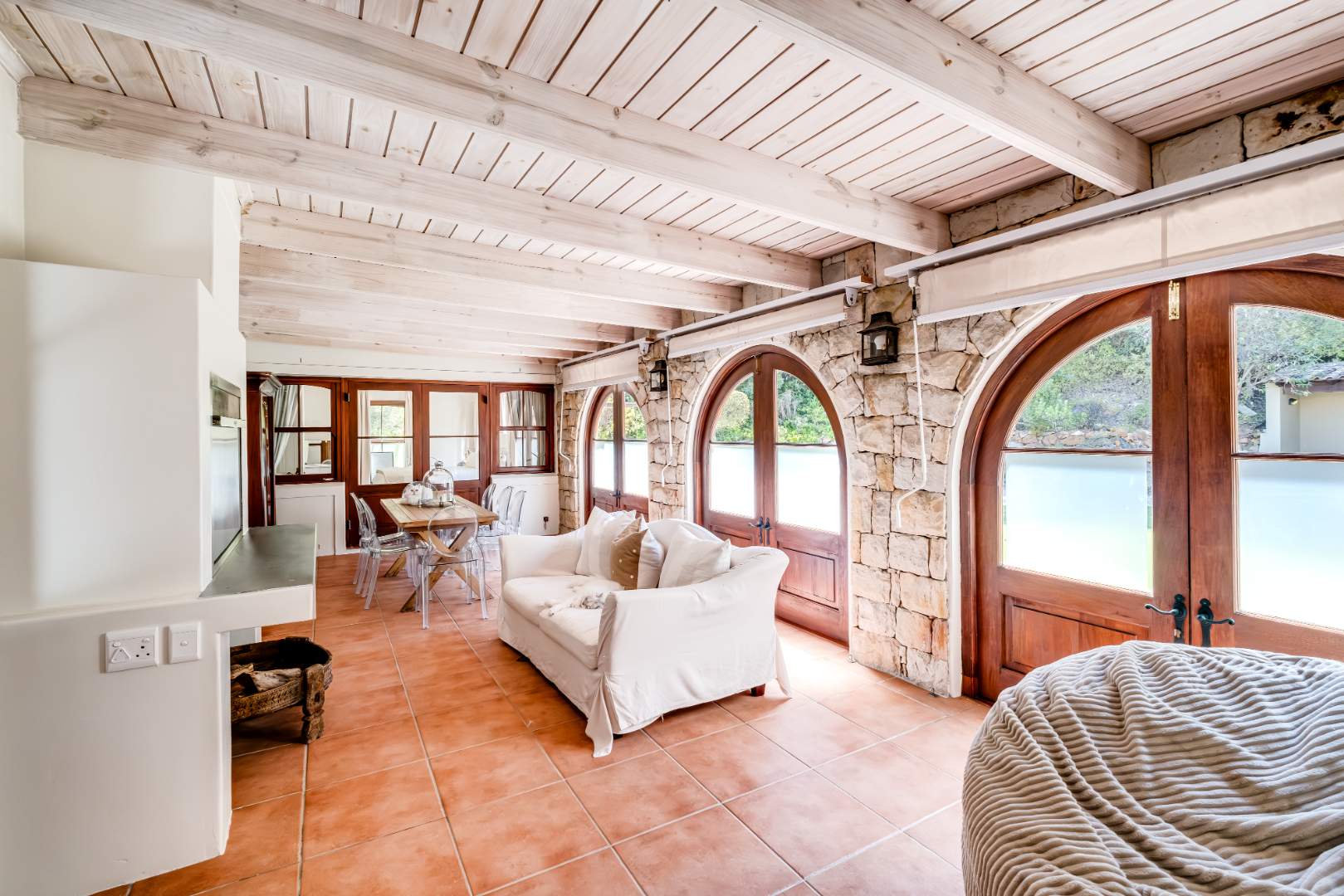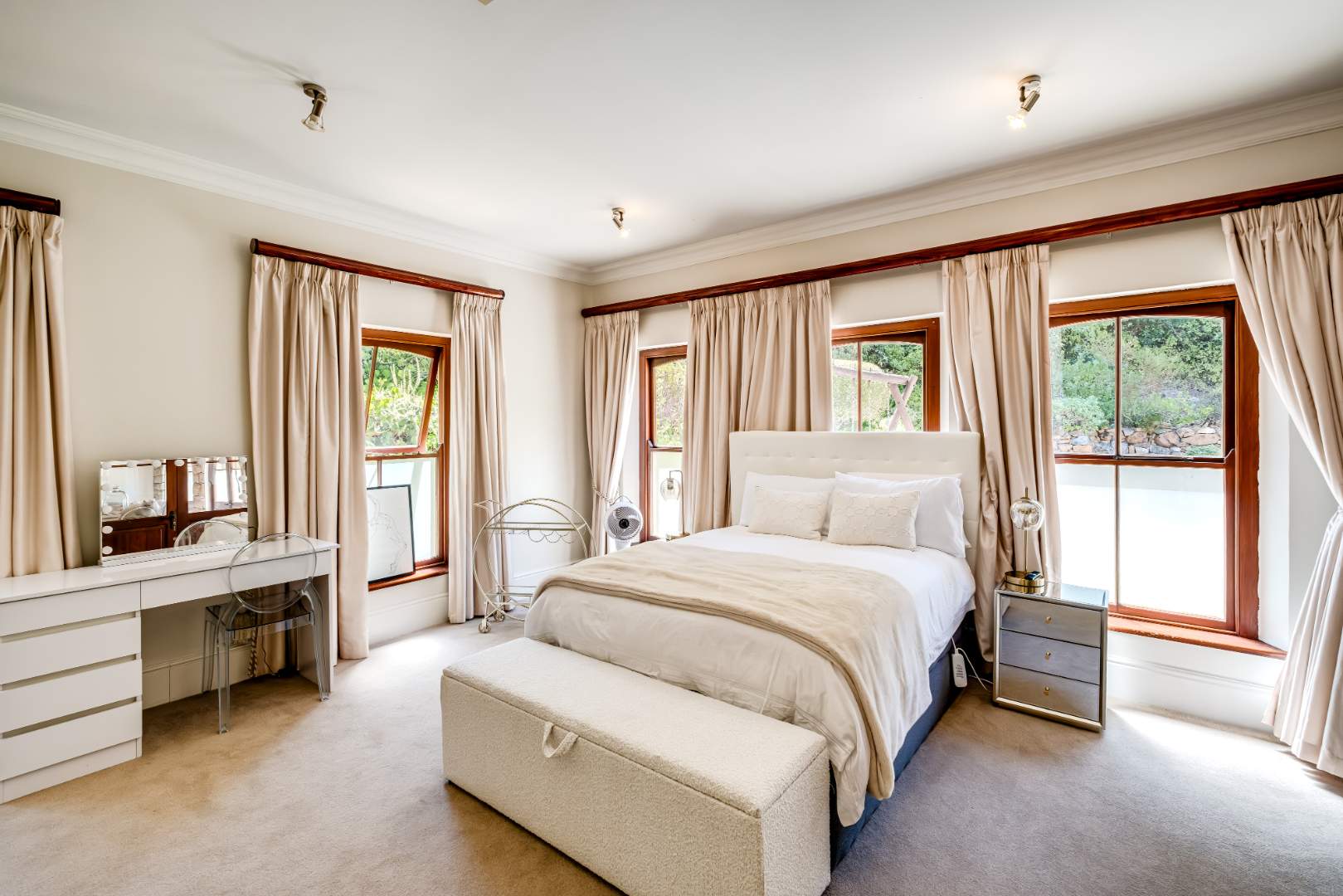 Four well appointed bedrooms (2 en-suite) located on the ground floor, open out to the garden and pool area. Downstairs, the fifth bedroom features its own en-suite bathroom and offers direct access to a beautifully landscaped garden, creating a private retreat for visitors.