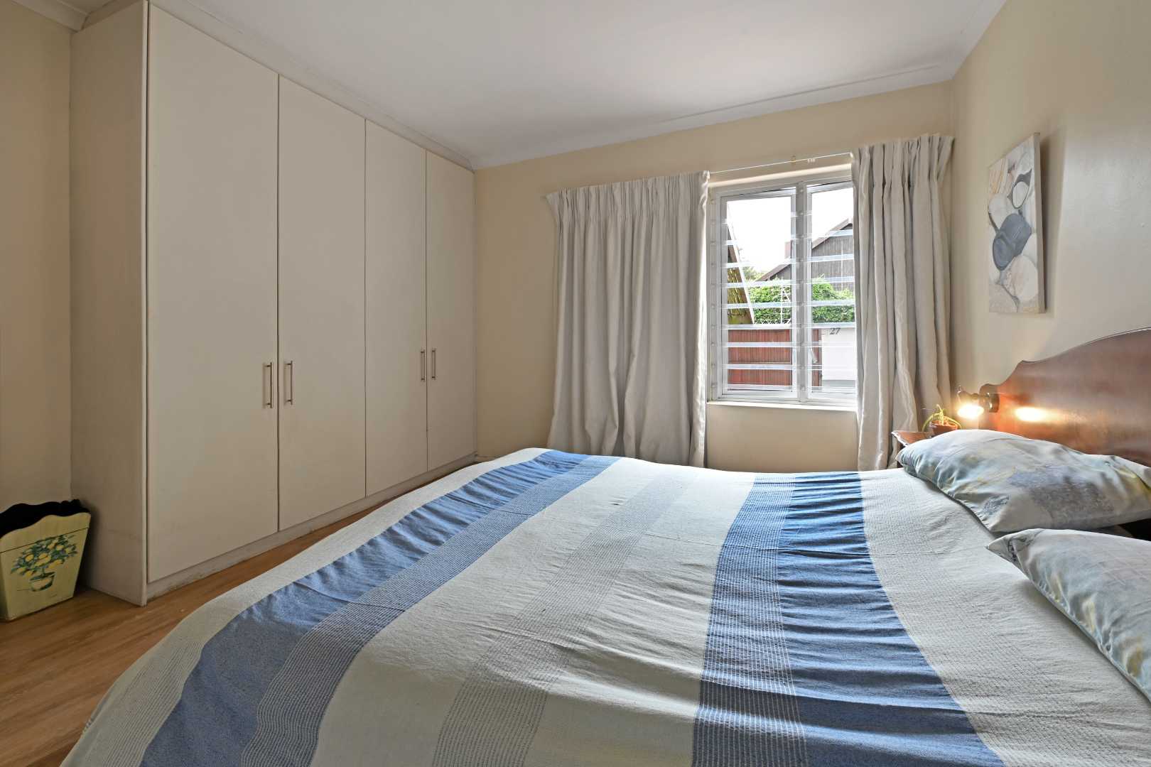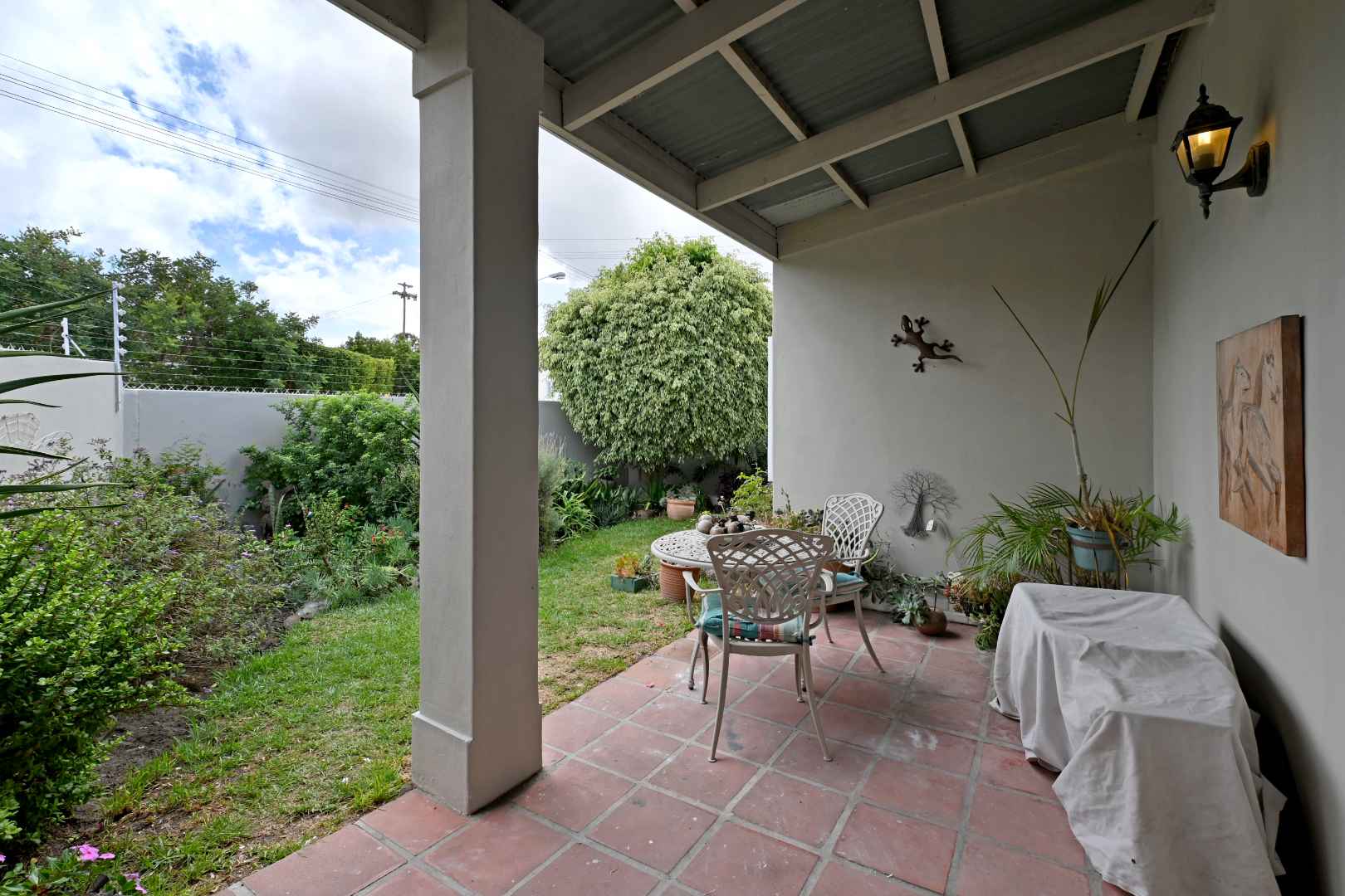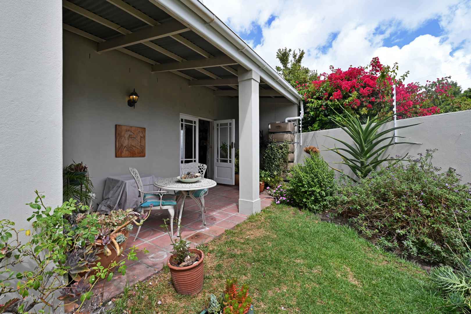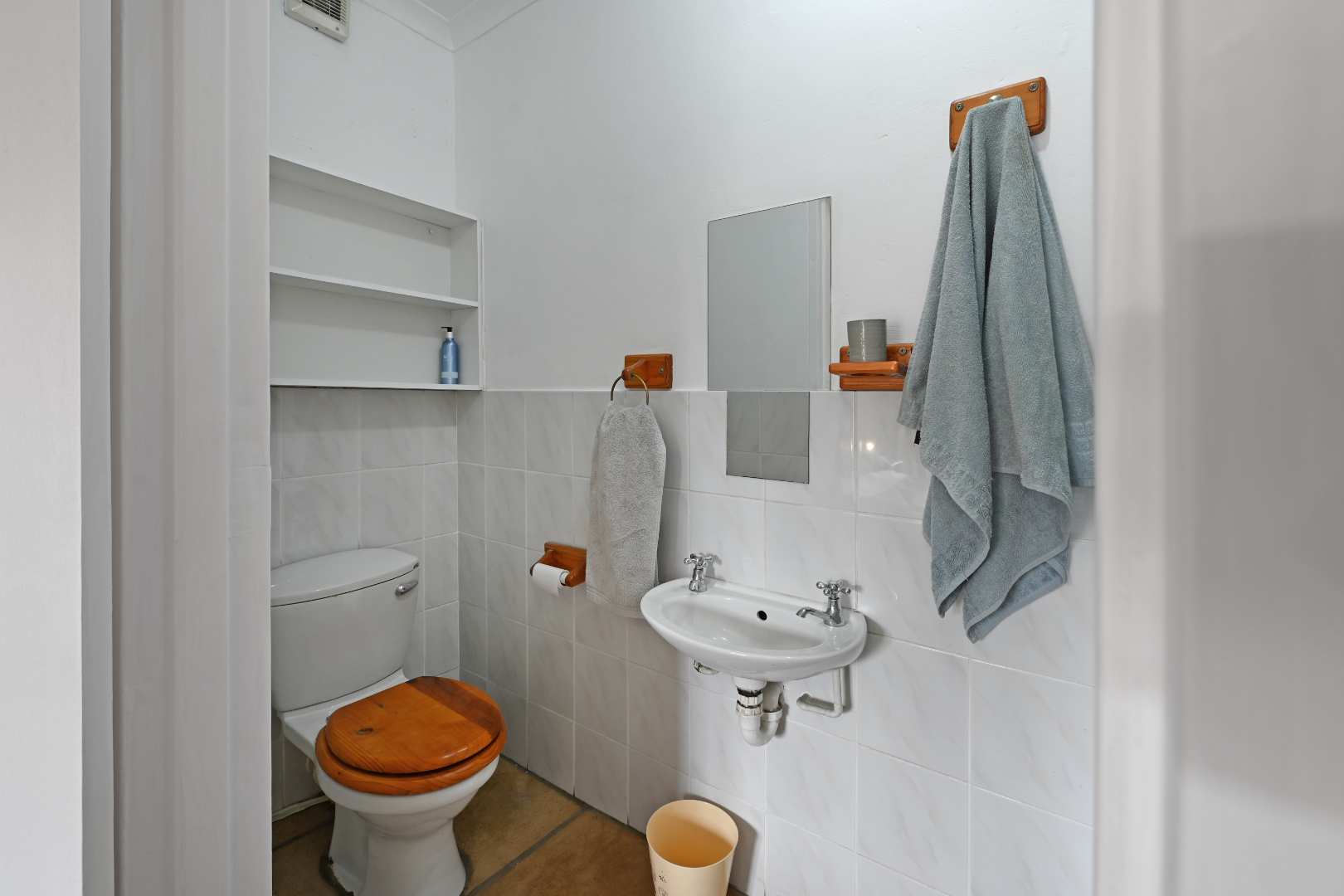 The kitchen is open plan to the dining room and offers granite tops, plumbing for 1 appliance, a double sink, a free standing stove and space for a single fridge. The dining room has doors leading out to the covered north facing patio and a cherished little garden. The lounge has laminate flooring and a cosy ambience with the slow burning wood fireplace. A guest cloakroom exists downstairs for the ease of entertaining.