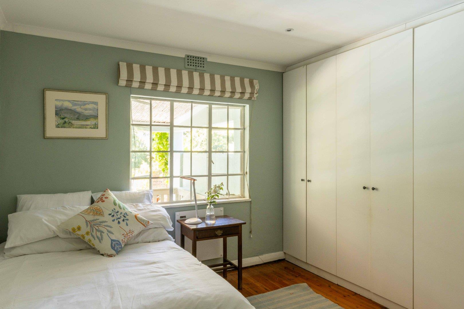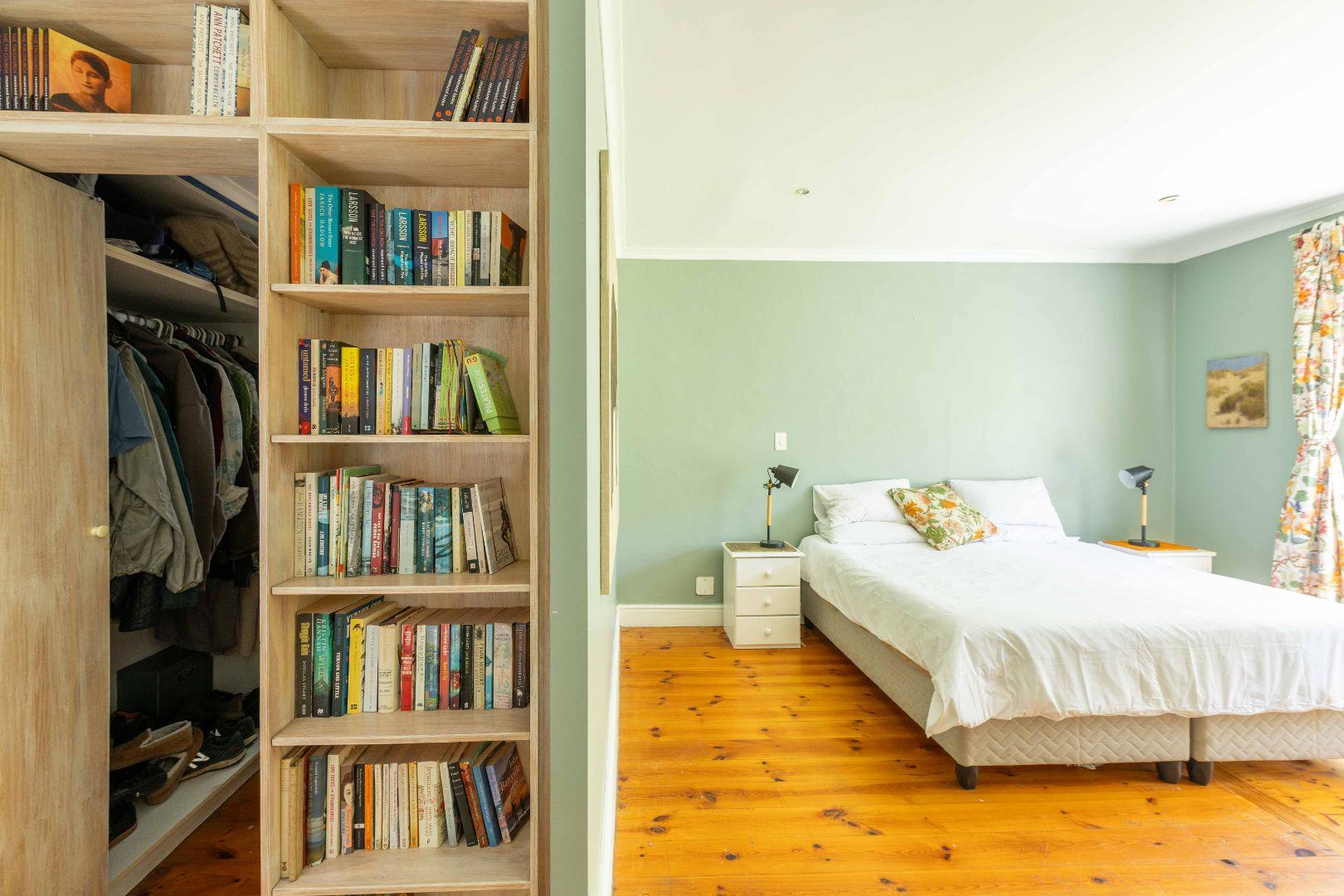 Down the passage is the main bedroom with Oregon floors and a beautiful view onto the back garden. It has a walk-in closet, built-in bookcase, and en-suite bathroom.
