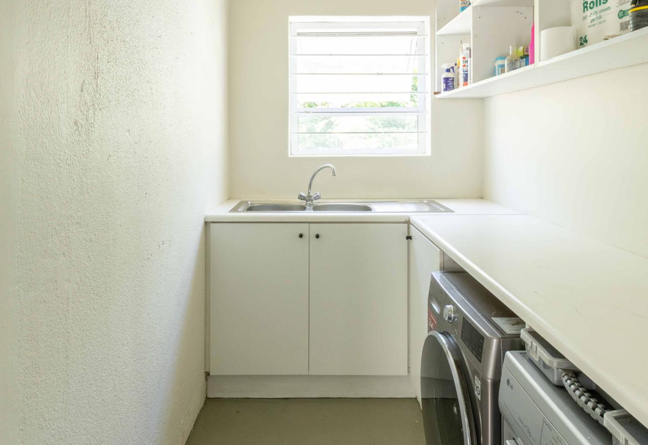 Separate utility room with storage/double-sink and plumping for a washing machine.