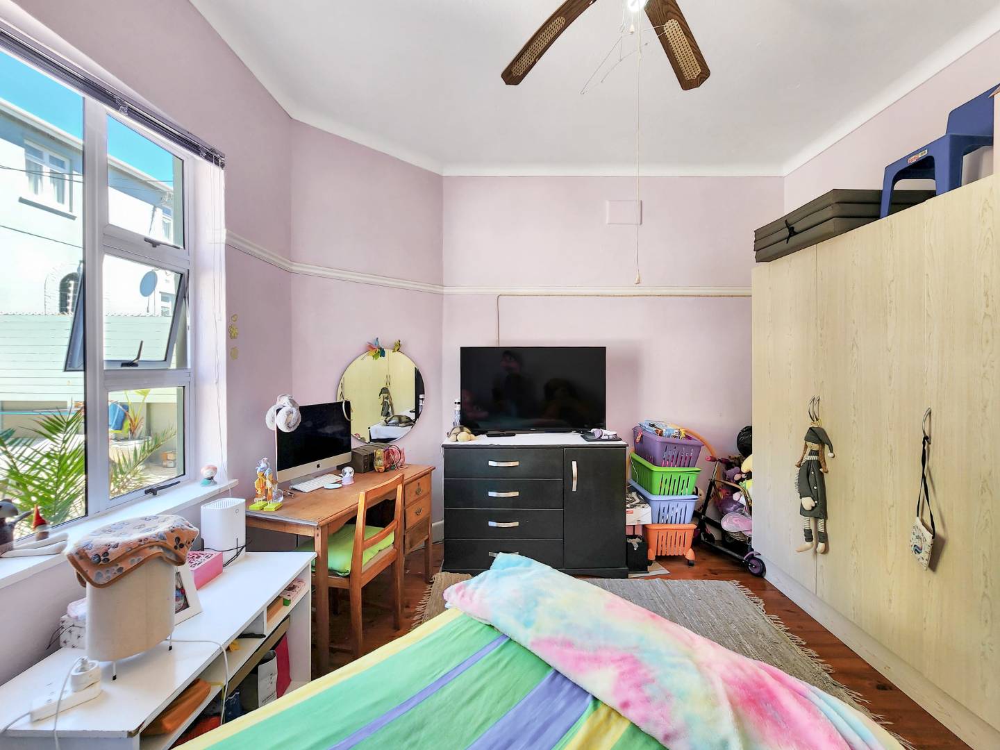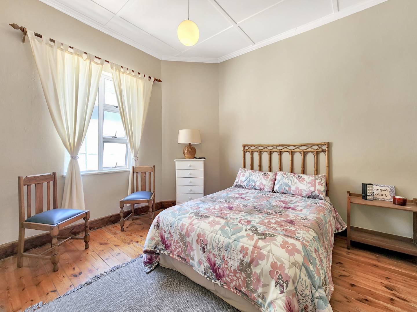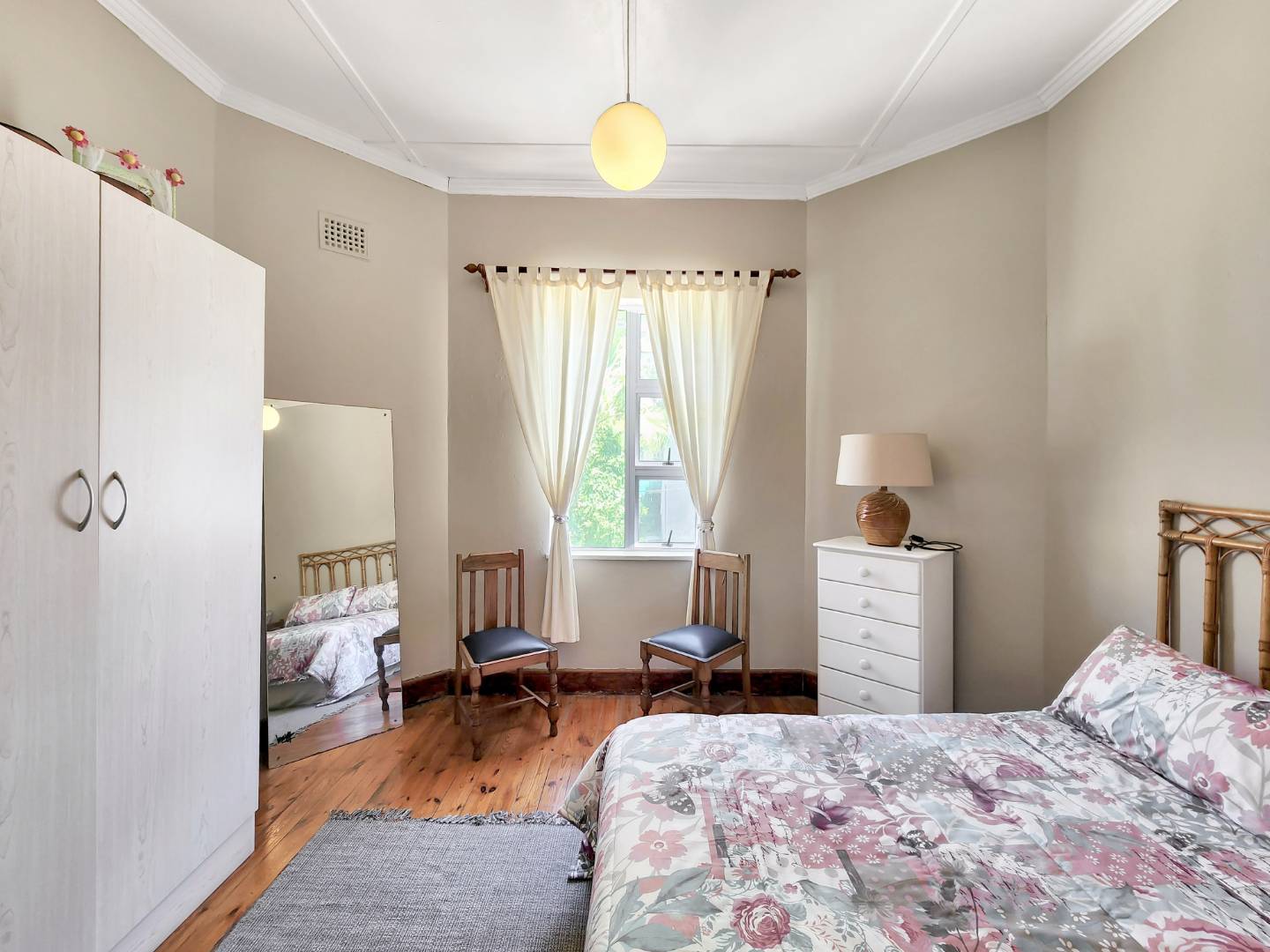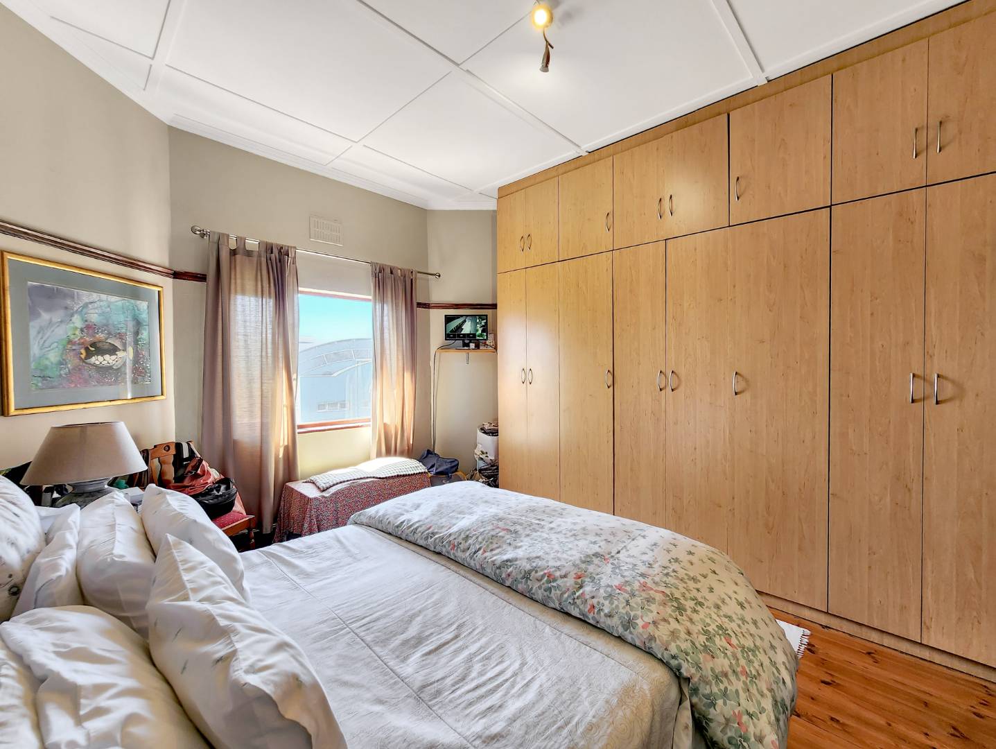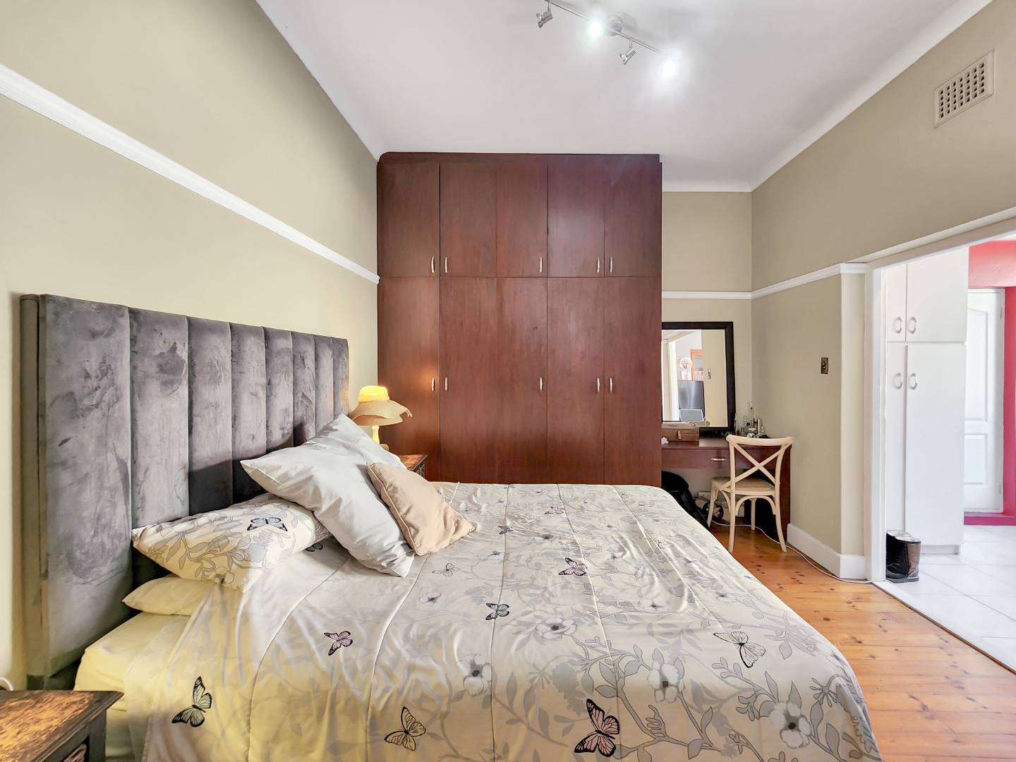 - Bedroom 2: West-facing with built-in cupboards.