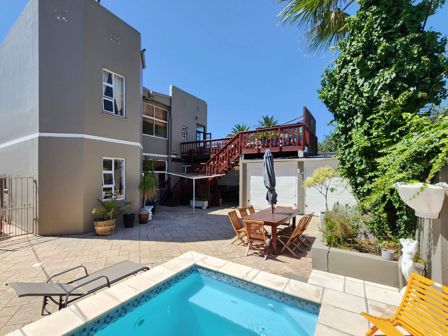 - Courtyard with a pool, pizza oven, and a versatile double garage/storeroom.