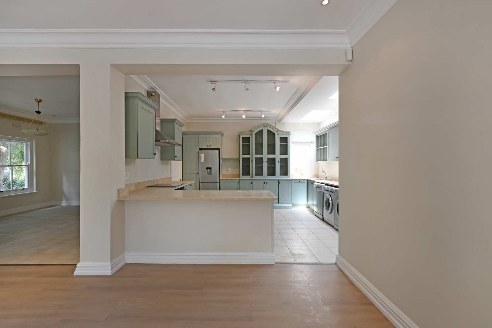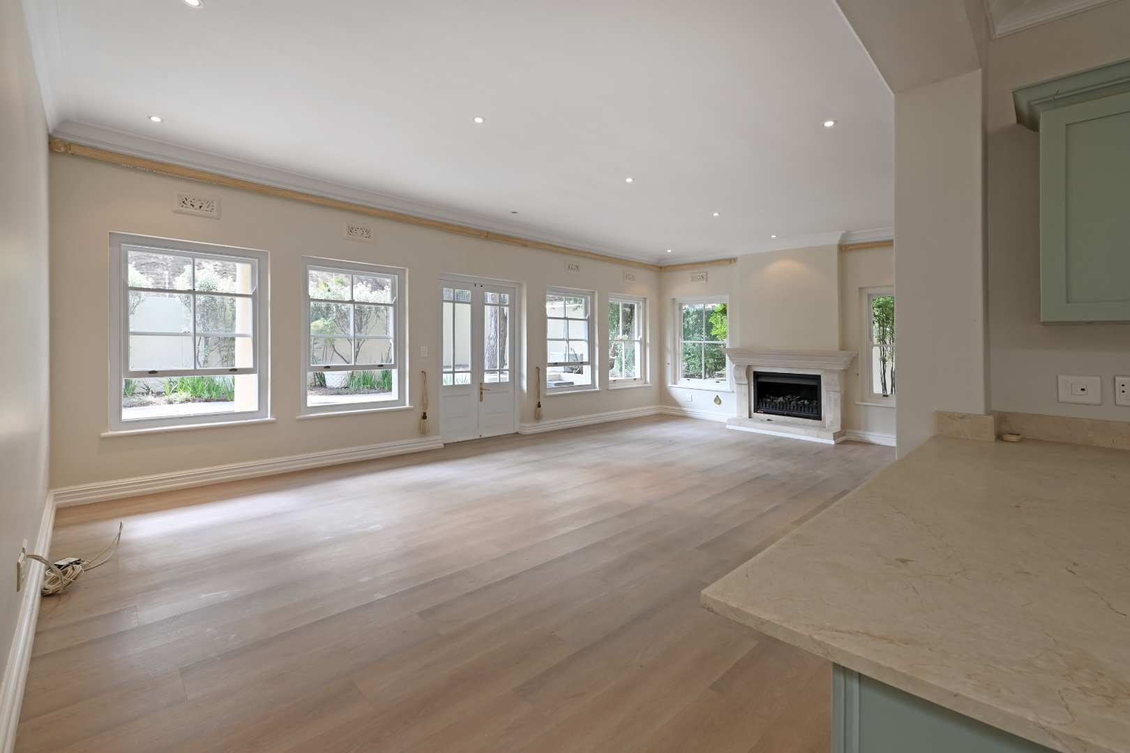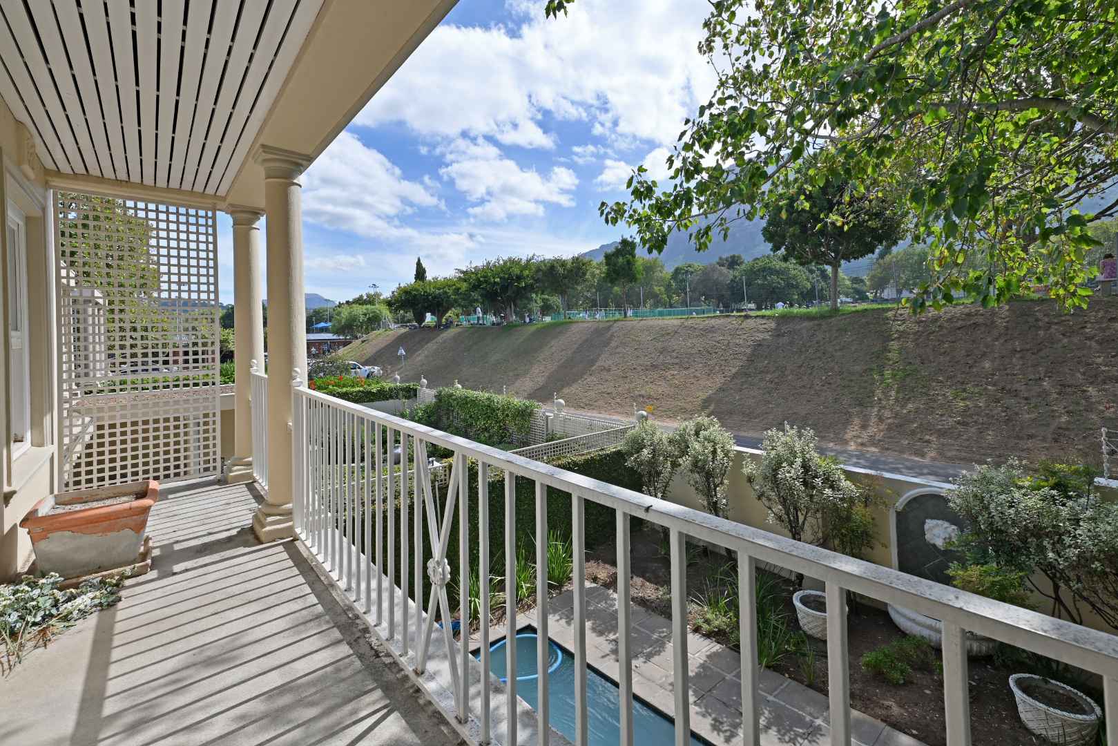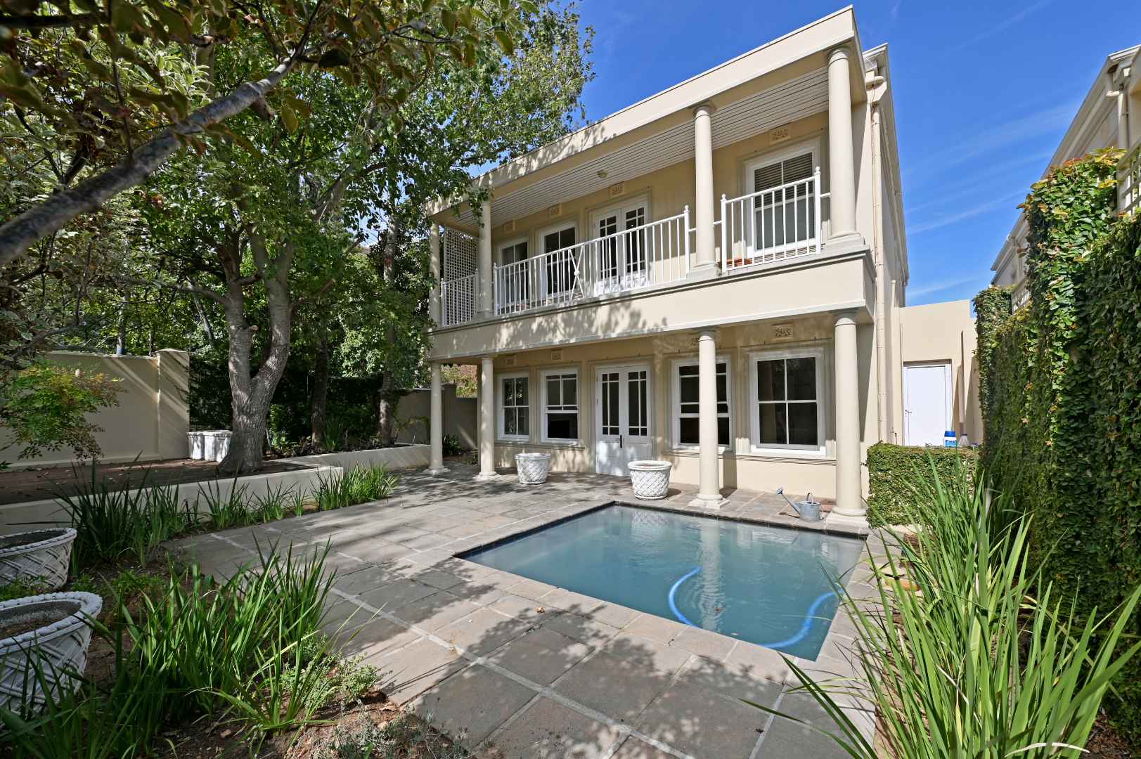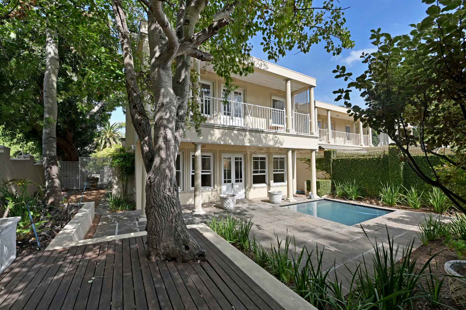 Downstairs offers a generously sized study, guest cloakroom, an inter-leading dining room, an open plan kitchen consisting of a country-style cabinetry, a double sink, plumbing for 3 appliances, electric stove/ oven/ extractor with stone top counters free flowing out to the spacious lounge giving that modern spacious feeling. Character sash windows, a gas fireplace and doors leading out to the paved patio with a low maintenance garden, plunge pool, mountain views and a decked sitting area underneath a shady tree completes this picture.