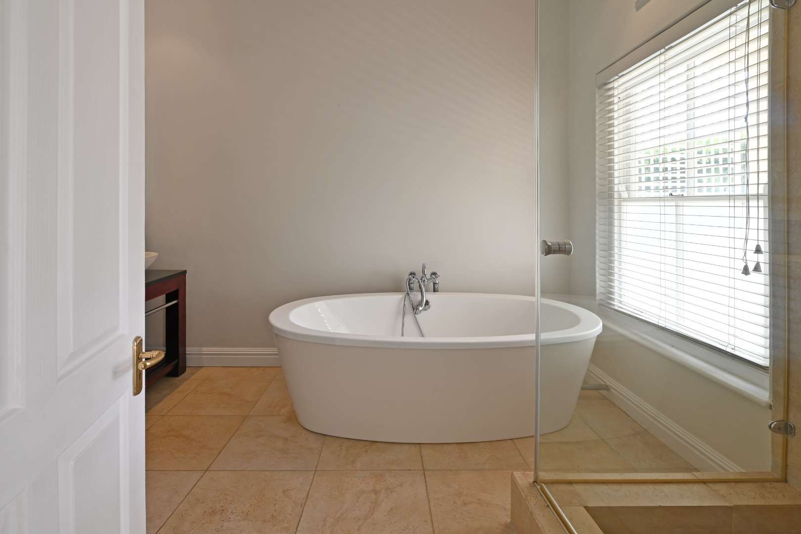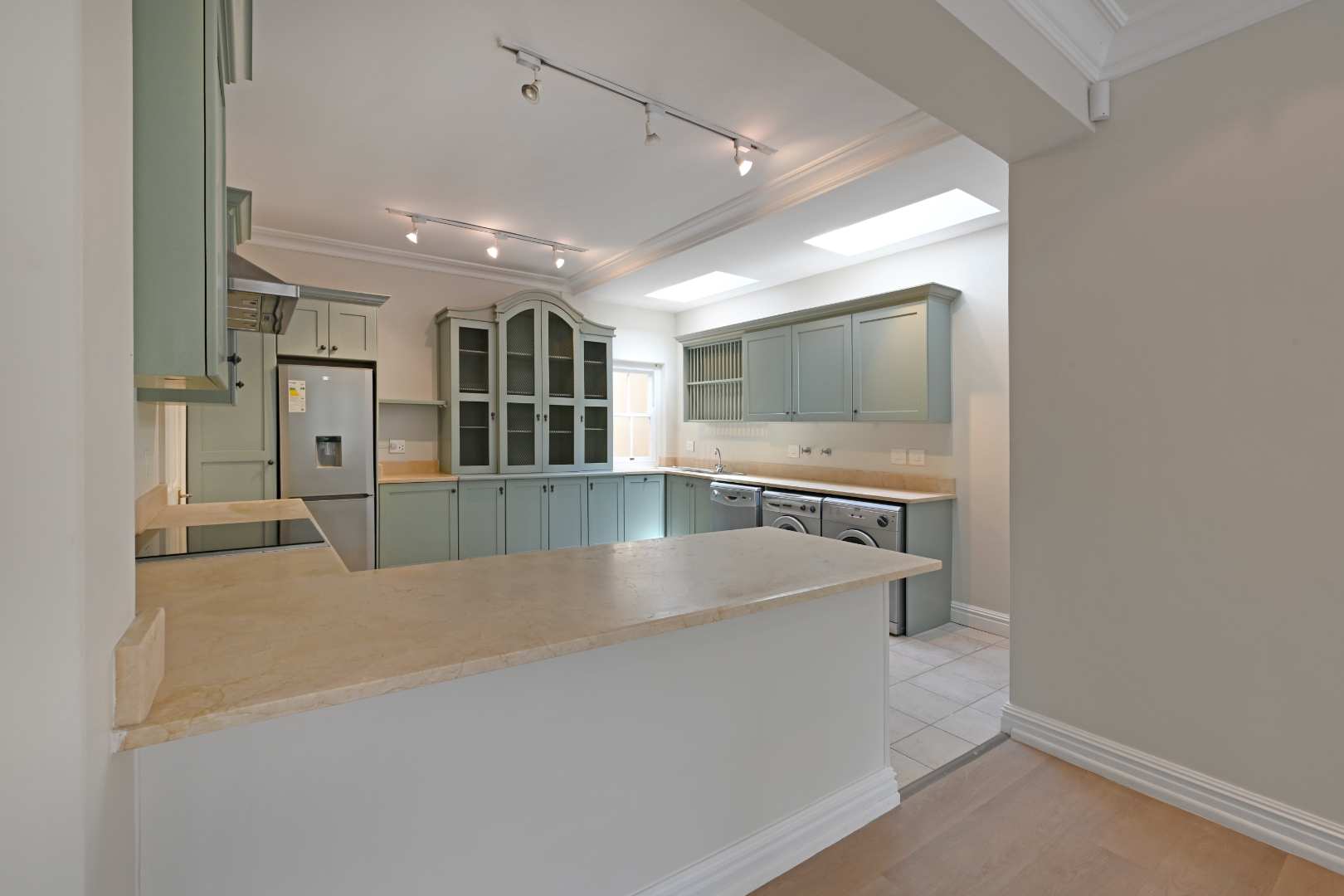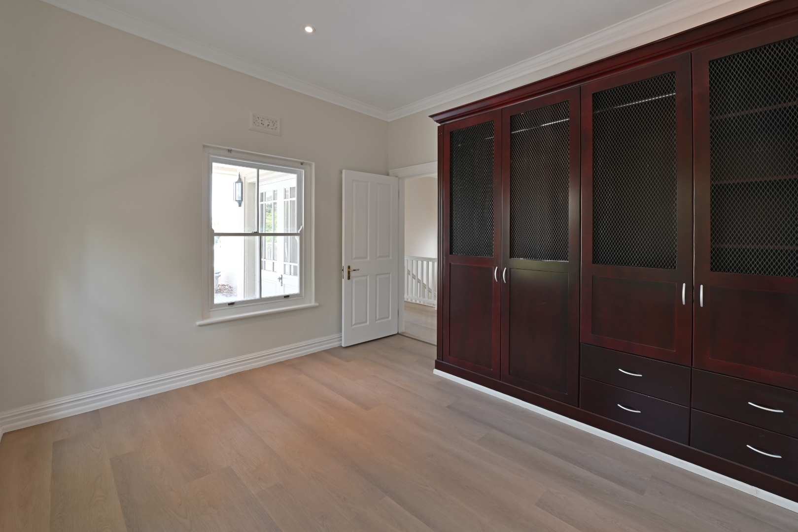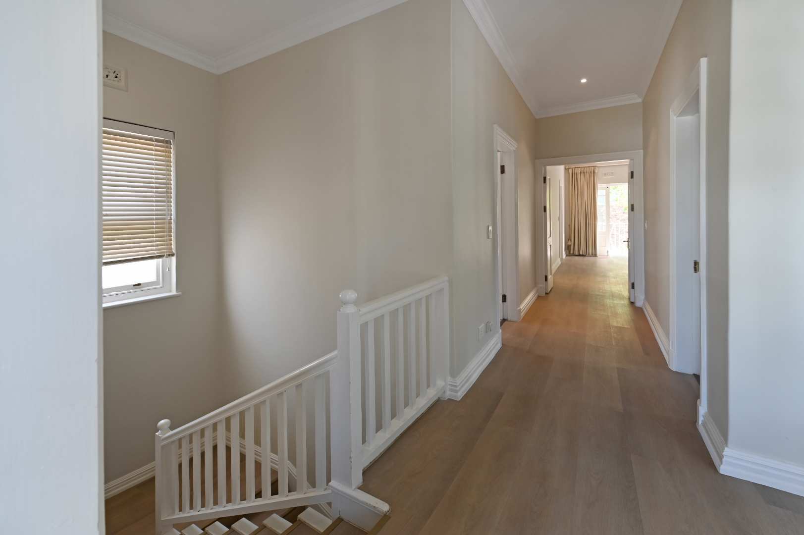 Downstairs offers a generously sized study, guest cloakroom, an inter-leading dining room, an open plan kitchen consisting of a country-style cabinetry, a double sink, plumbing for 3 appliances, electric stove/ oven/ extractor with stone top counters free flowing out to the spacious lounge giving that modern spacious feeling. Character sash windows, a gas fireplace and doors leading out to the paved patio with a low maintenance garden, plunge pool, mountain views and a decked sitting area underneath a shady tree completes this picture.