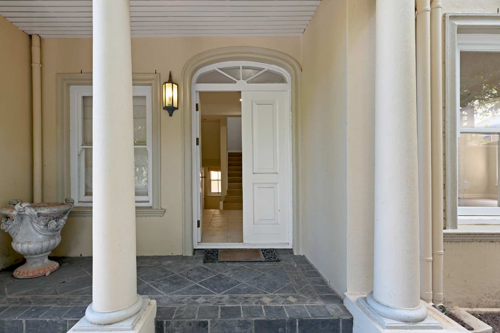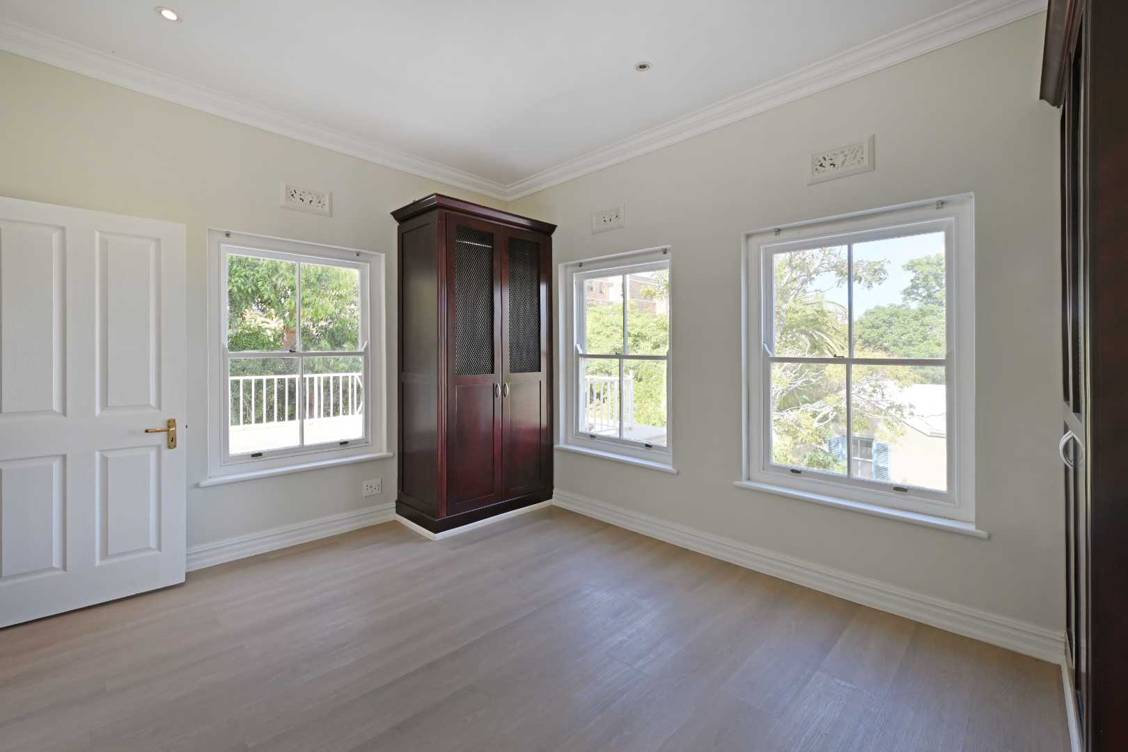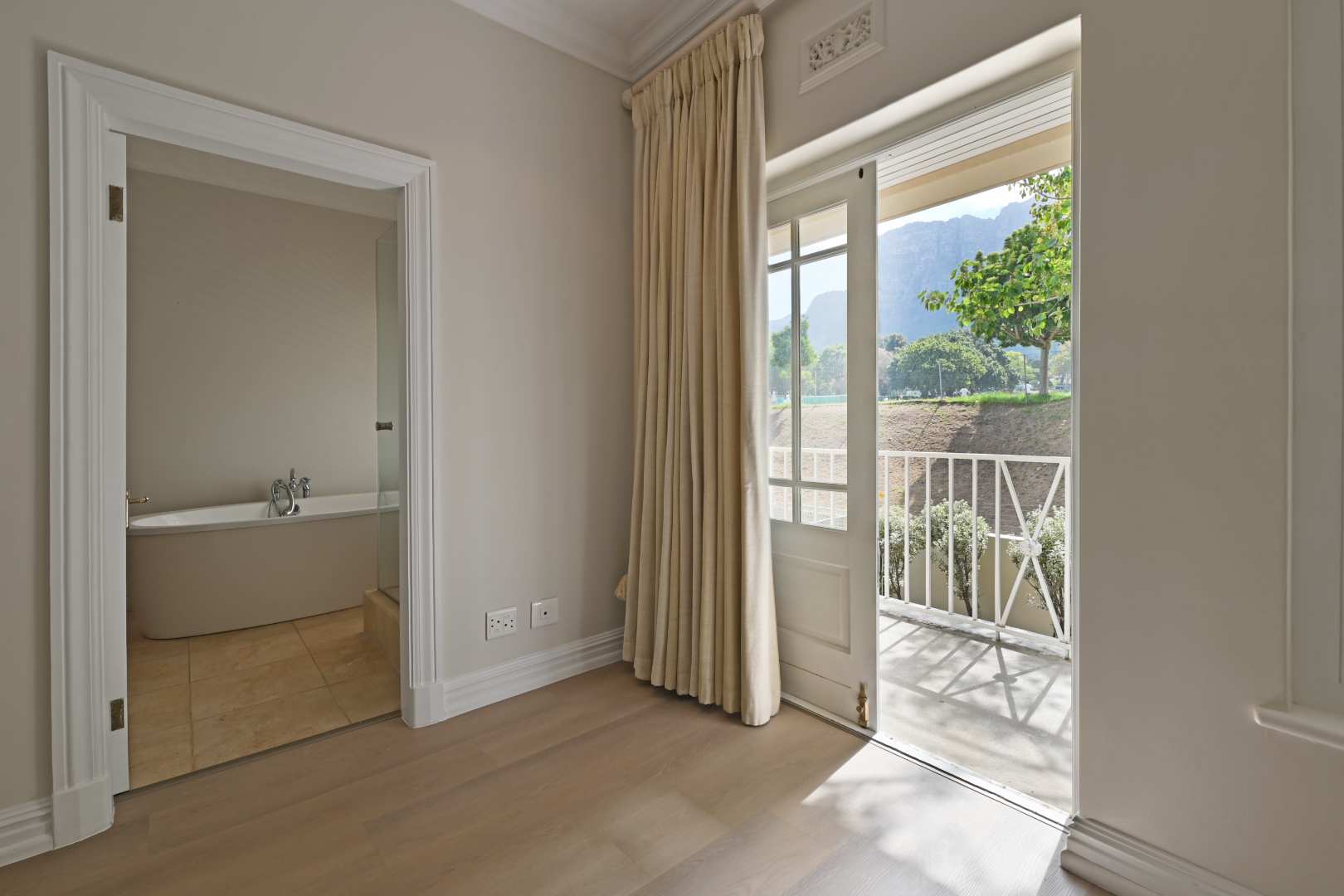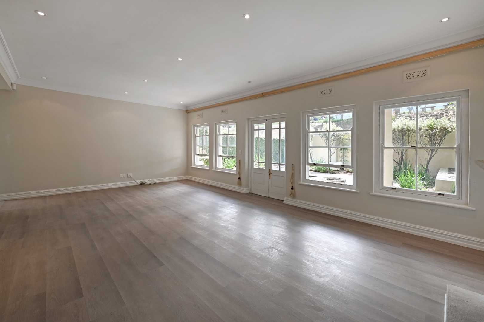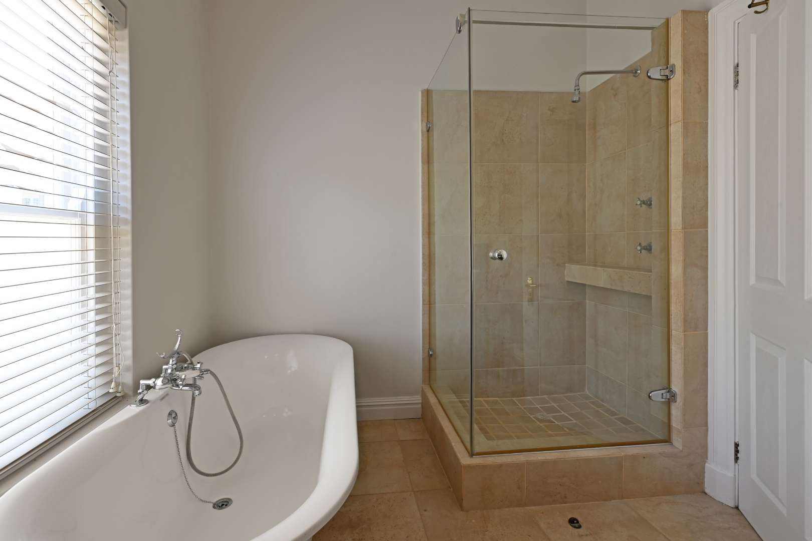 Downstairs offers a generously sized study, guest cloakroom, an inter-leading dining room, an open plan kitchen consisting of a country-style cabinetry, a double sink, plumbing for 3 appliances, electric stove/ oven/ extractor with stone top counters free flowing out to the spacious lounge giving that modern spacious feeling. Character sash windows, a gas fireplace and doors leading out to the paved patio with a low maintenance garden, plunge pool, mountain views and a decked sitting area underneath a shady tree completes this picture.