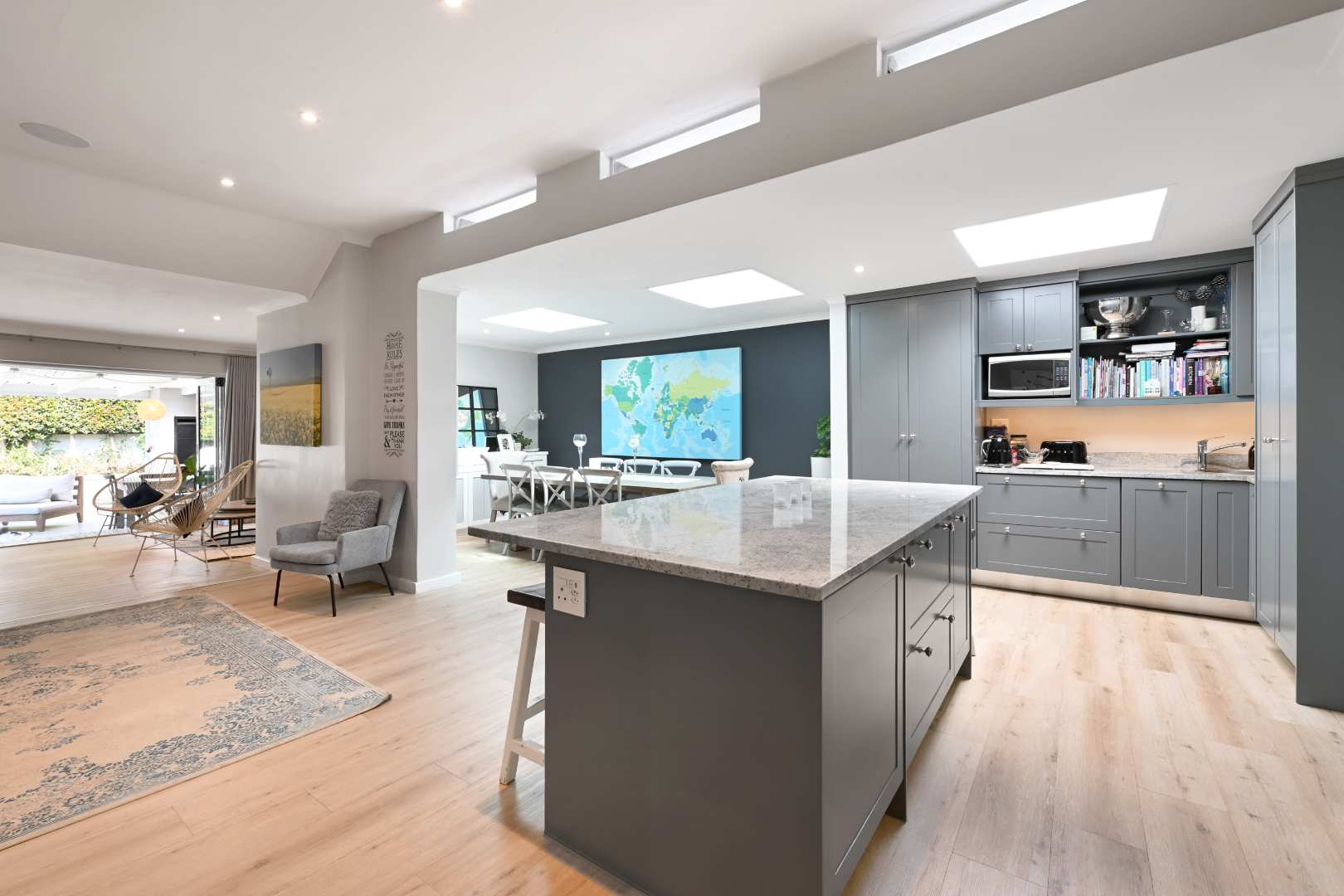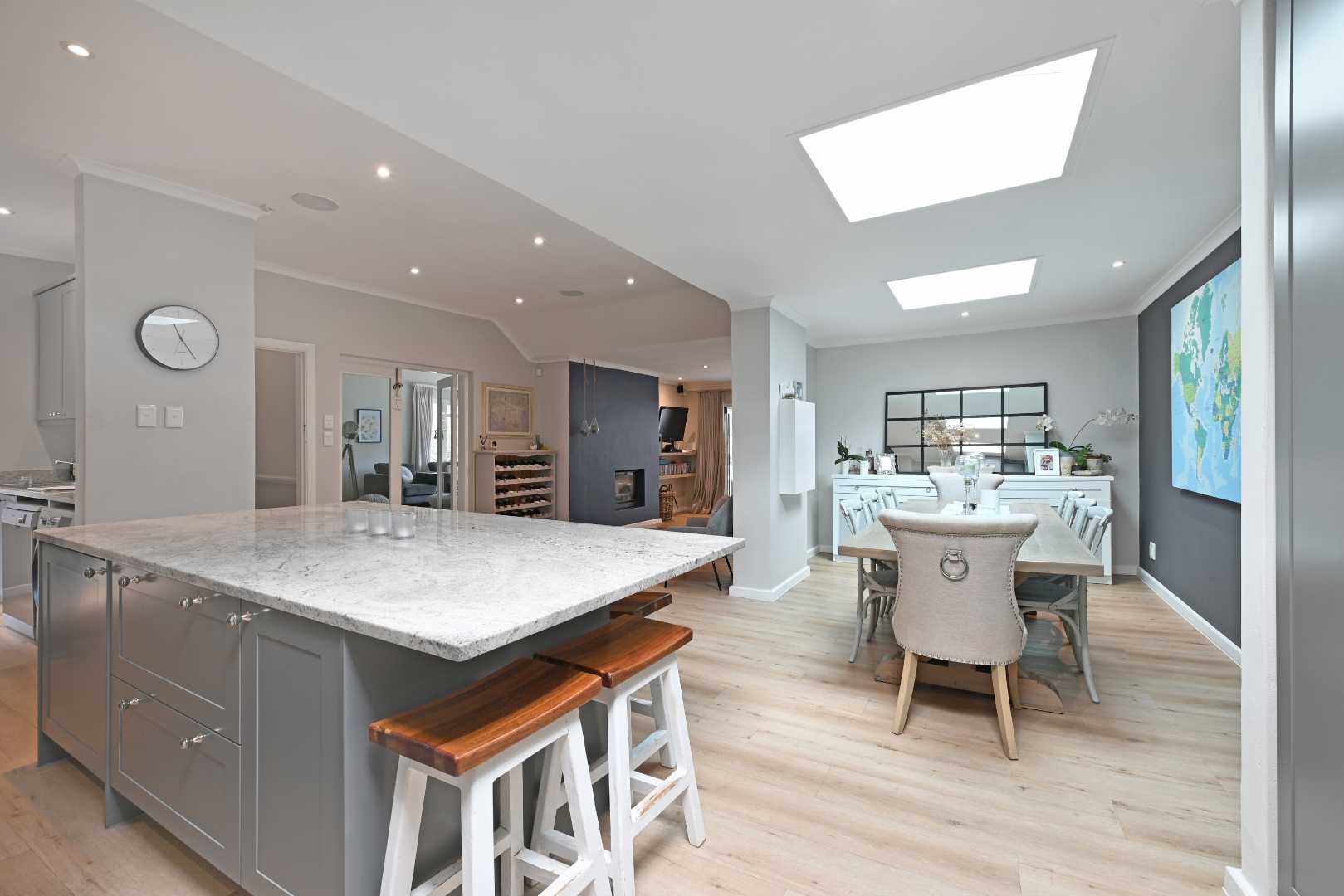 Stylish open plan living free flowing from the kitchen right through to the indoor braai room and out through frameless stacking glass doors to the private, sun filled garden with an inviting pool. The kitchen consists of granite tops throughout with a generously sized centre island, electric SMEG, prep sink and scullery/ laundry, with a 10 seater dining room in close proximity for the ease of entertaining. The separate “formal” lounge was previously used as space away from kid-chaos but also the ideal playroom/ teen entertainment space, with a feature double sided fireplace to link the living areas. A smaller TV nook exists amongst the offering with a fitted study to top it all off.