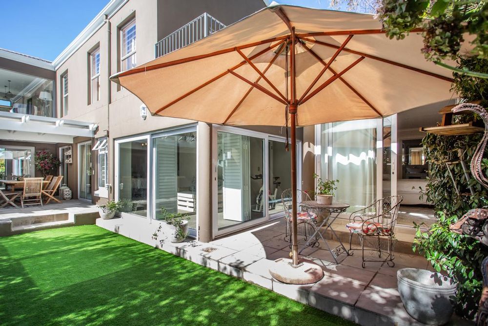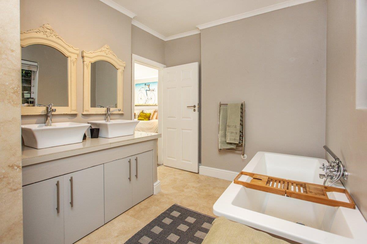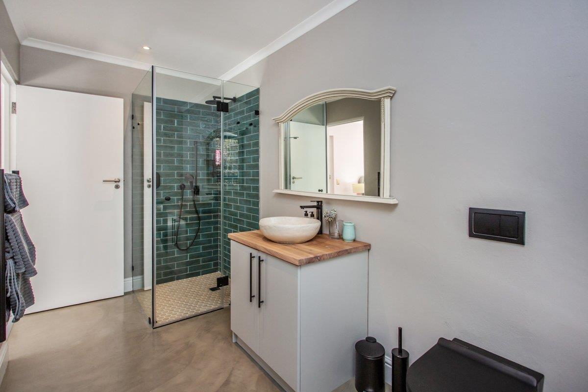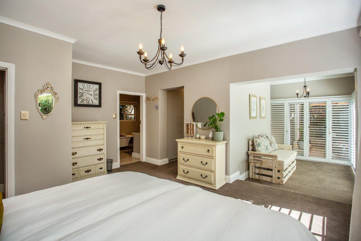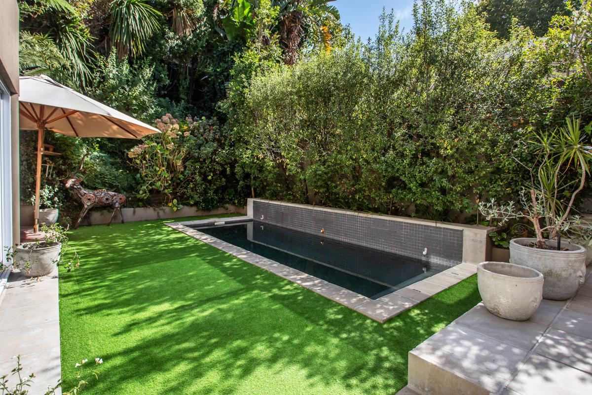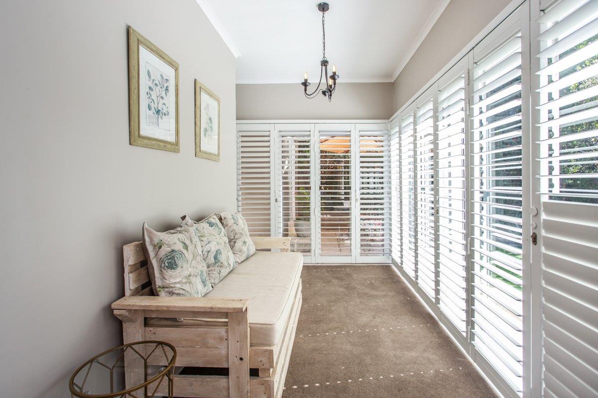 As the double storey level is a brand new addition, the original carpeted main suite is located downstairs with a walk-in closet, a lounge nook, a full en-suite with a double vanity, fitted American shutters and aluminium doors all opening out to the North facing AstroTurf garden and solar heated pool. (Bedroom 3)