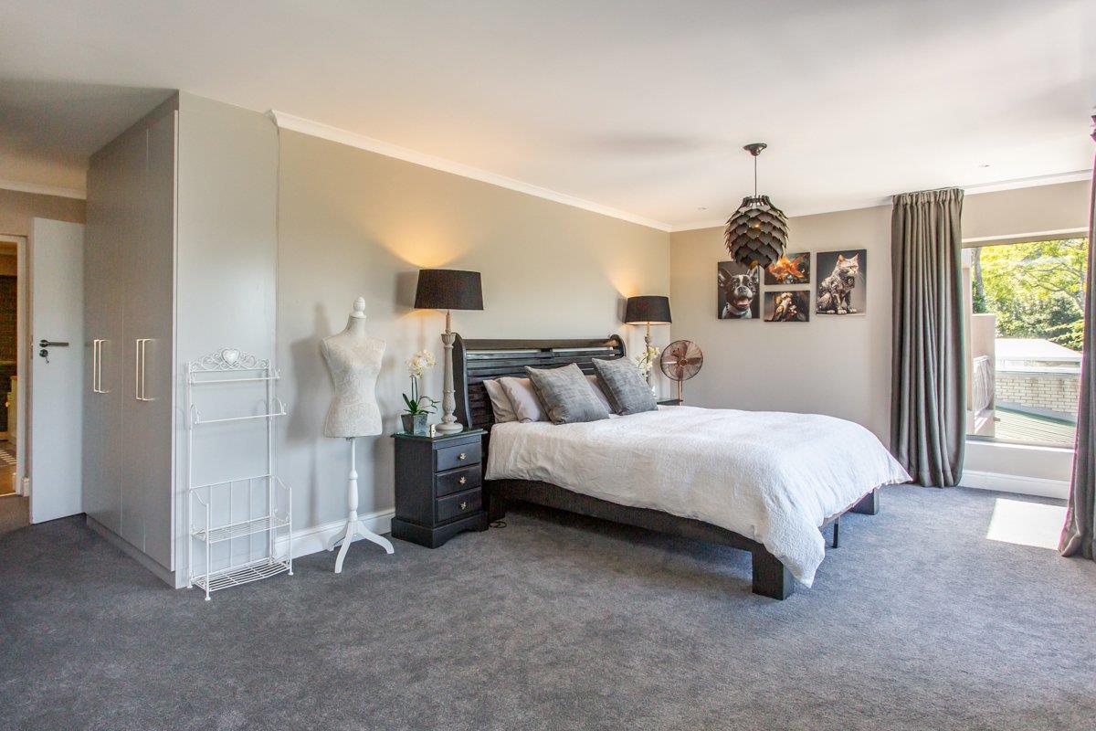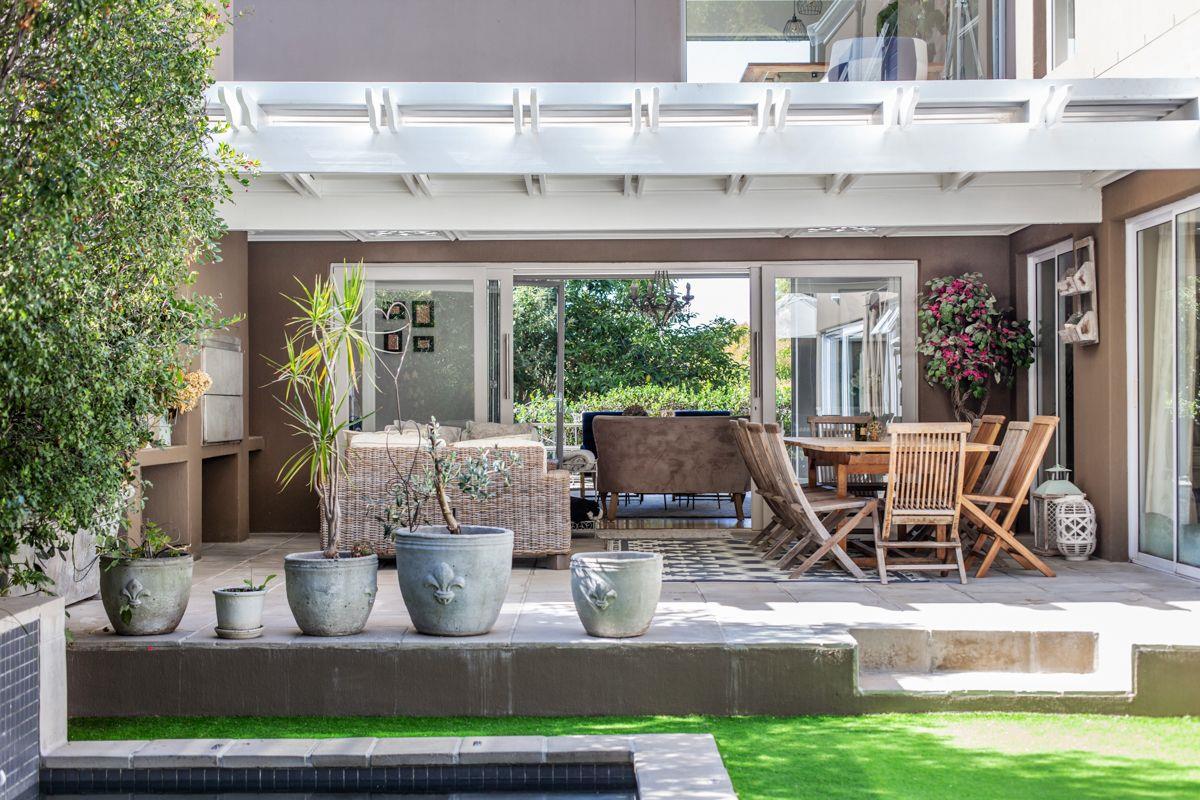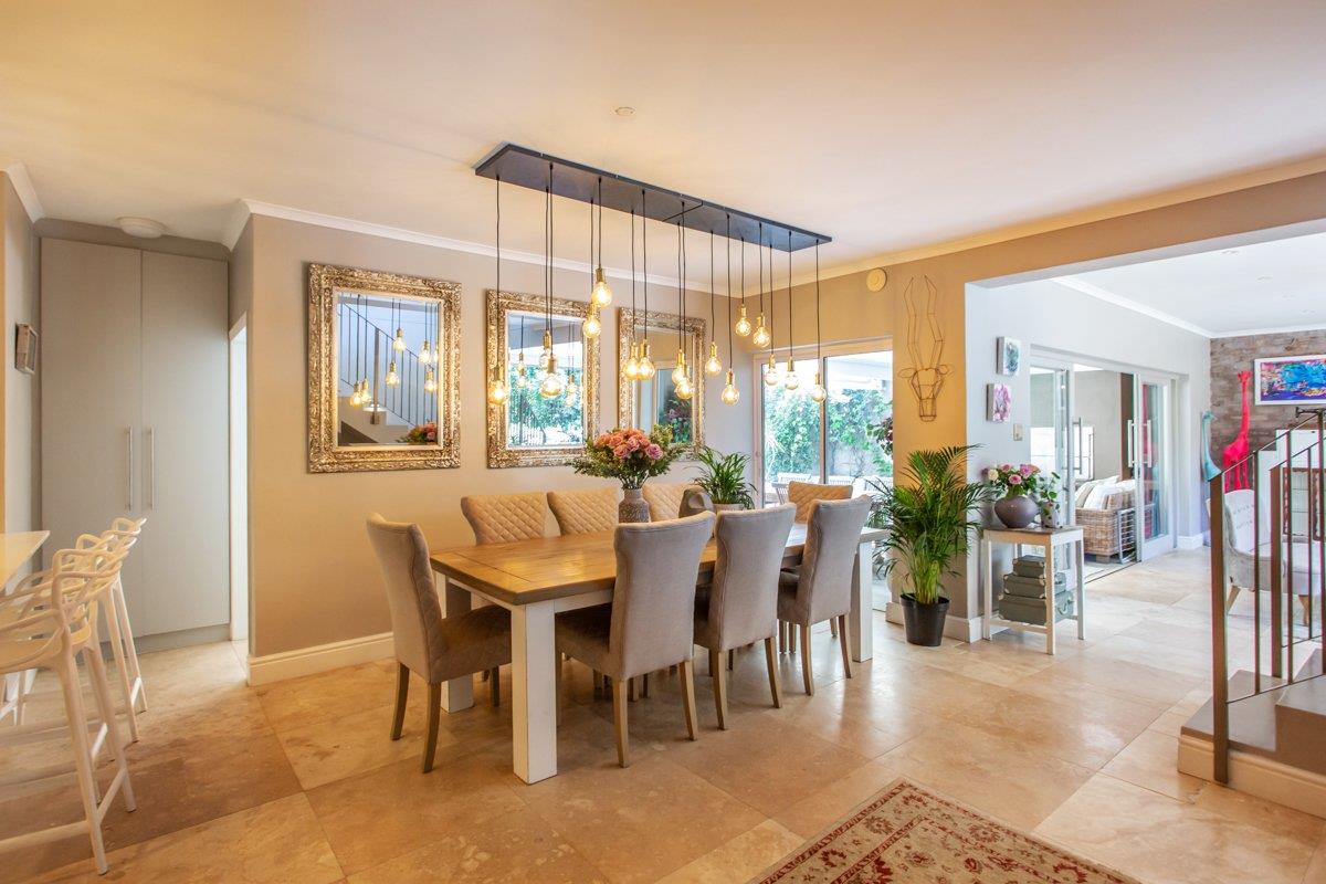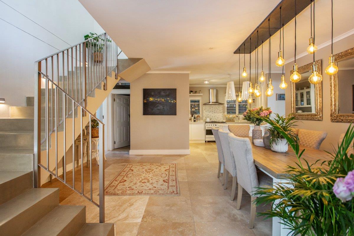 The downstairs tiled lounge with a gas fireplace has the perfect flow from East to West, both offering outdoor entertainment whichever direction you go. With aluminium doors opening out to the covered patio with a built-in braai and encompassing weather blinds, or go East to catch that morning sunrise with a water feature for ambience. Continue on to the inter-leading tiled dining room with a trendy chandelier, and stylish open plan kitchen consisting of Caesar stone counter tops, a breakfast eat in counter, gas SMEG, ample BICs, double fridge space, wine fridge space and a scullery/ laundry with plumbing for 3 appliances.