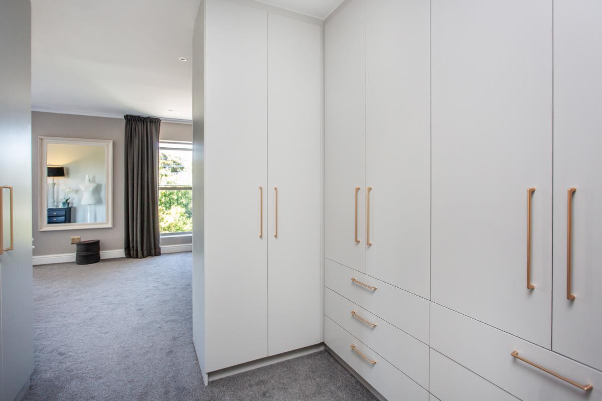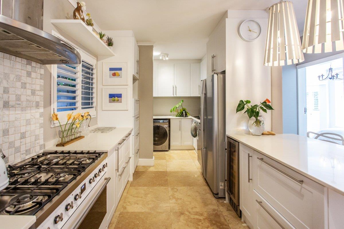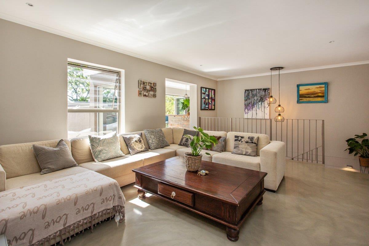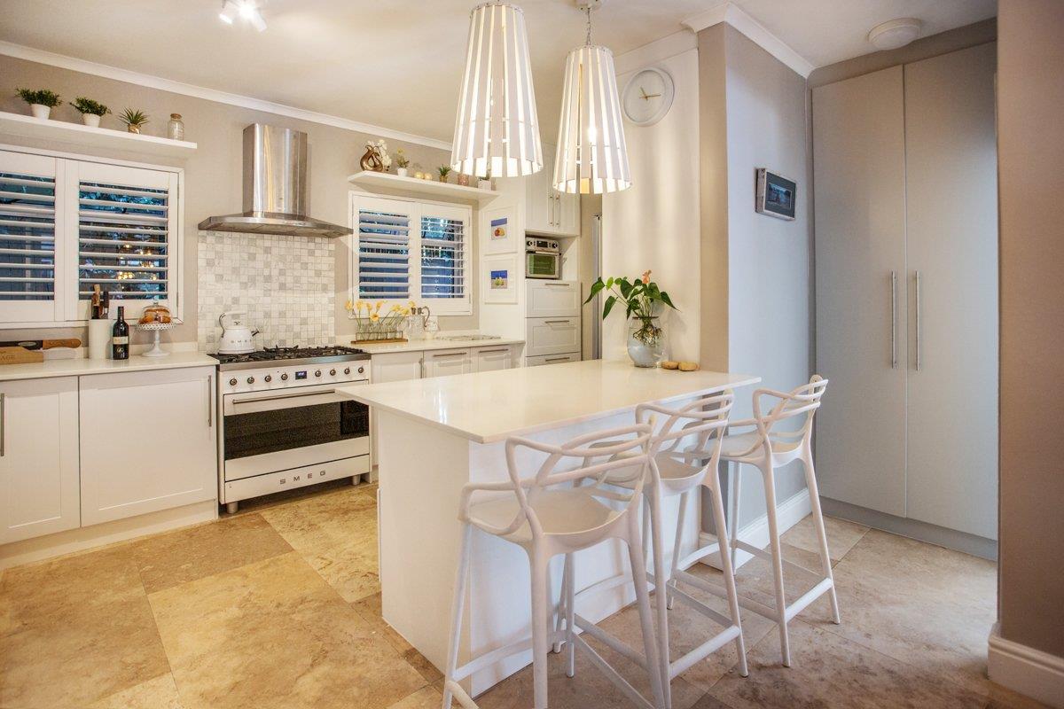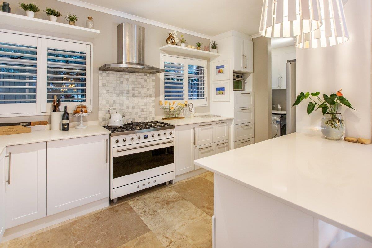The downstairs tiled lounge with a gas fireplace has the perfect flow from East to West, both offering outdoor entertainment whichever direction you go. With aluminium doors opening out to the covered patio with a built-in braai and encompassing weather blinds, or go East to catch that morning sunrise with a water feature for ambience. Continue on to the inter-leading tiled dining room with a trendy chandelier, and stylish open plan kitchen consisting of Caesar stone counter tops, a breakfast eat in counter, gas SMEG, ample BICs, double fridge space, wine fridge space and a scullery/ laundry with plumbing for 3 appliances.