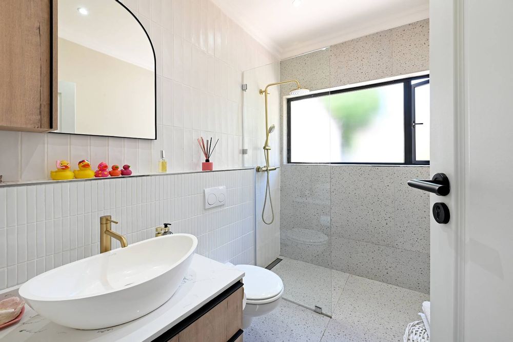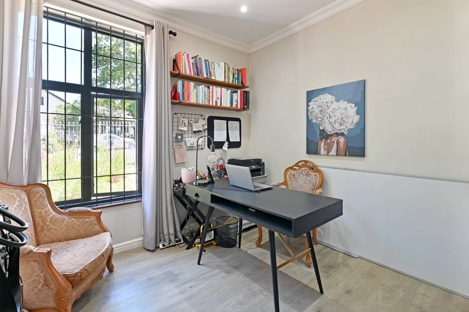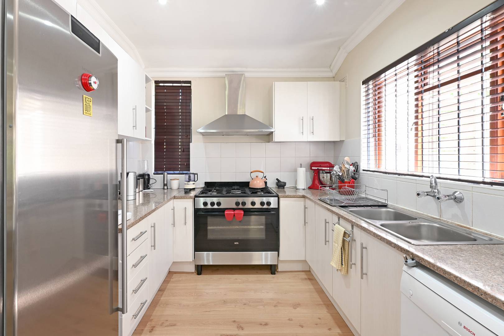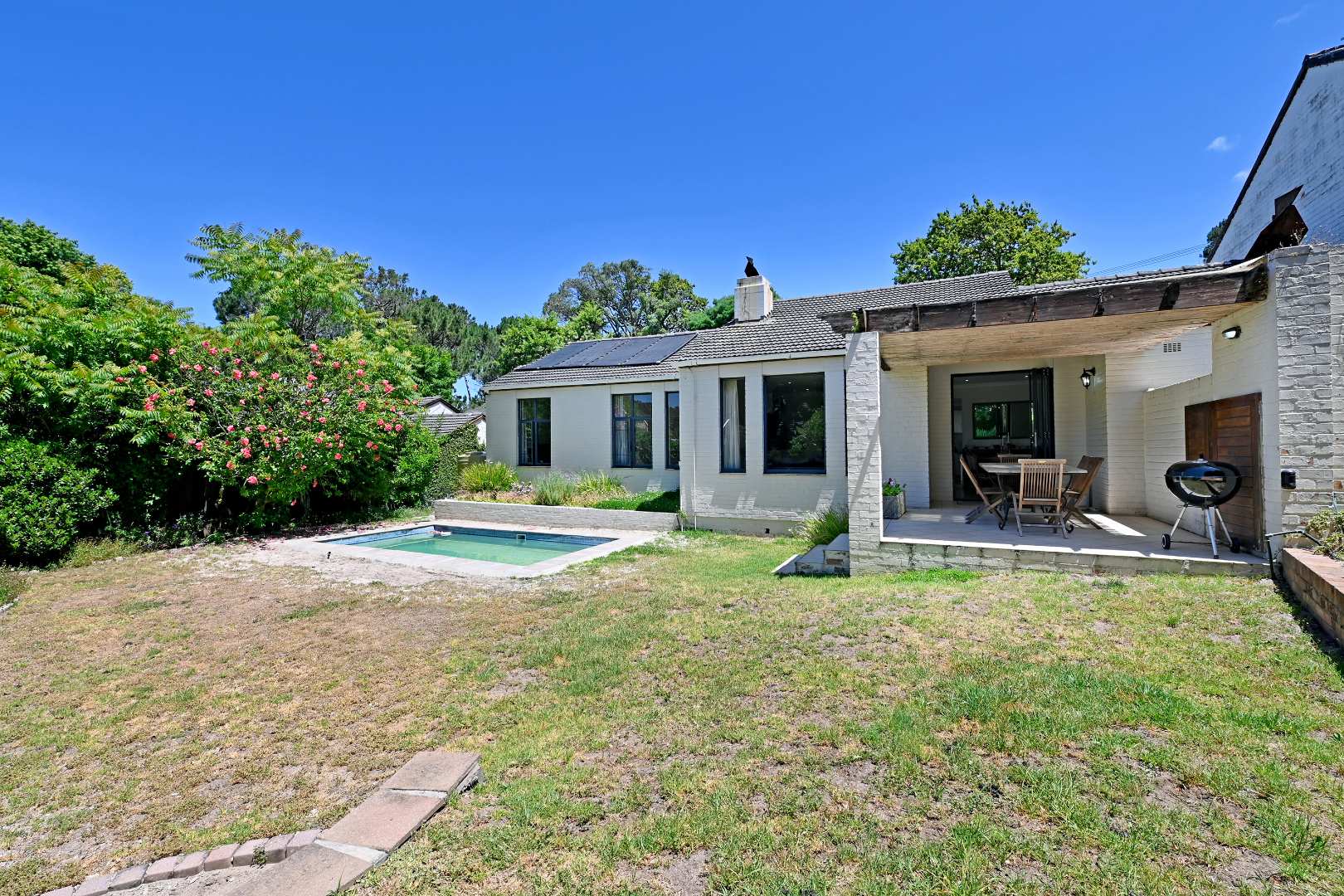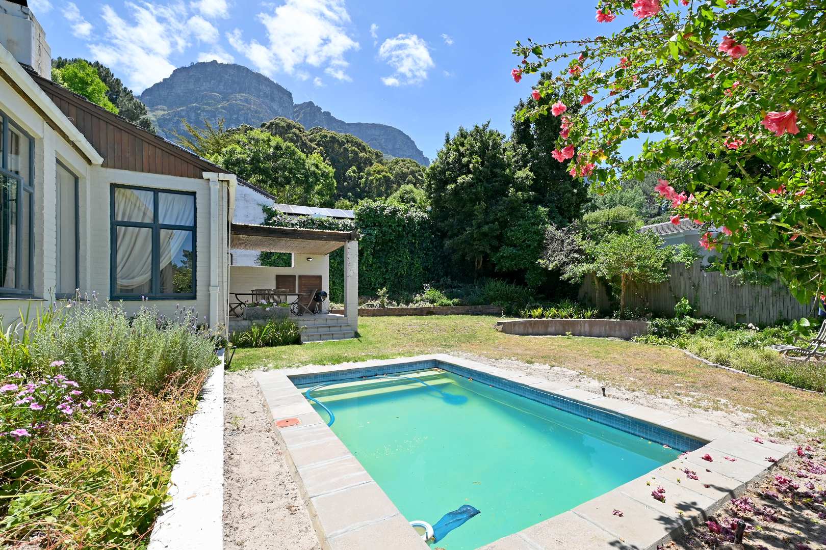 Offering 3 bedrooms, 1.5 bathrooms, stylish open plan living with wooden floors and a slow burning fireplace leading out through aluminium doors to a covered patio and exclusive garden setting with computerised irrigation and mountain views. A separate study, laundry room and cloakroom exist off the living room with direct access from a single garage and secure parking for another car behind the gate. The kitchen consists of a granite Centre Island, plumbing for 1 appliance, double sink and a free-standing AEG gas stove/ oven/ extractor.