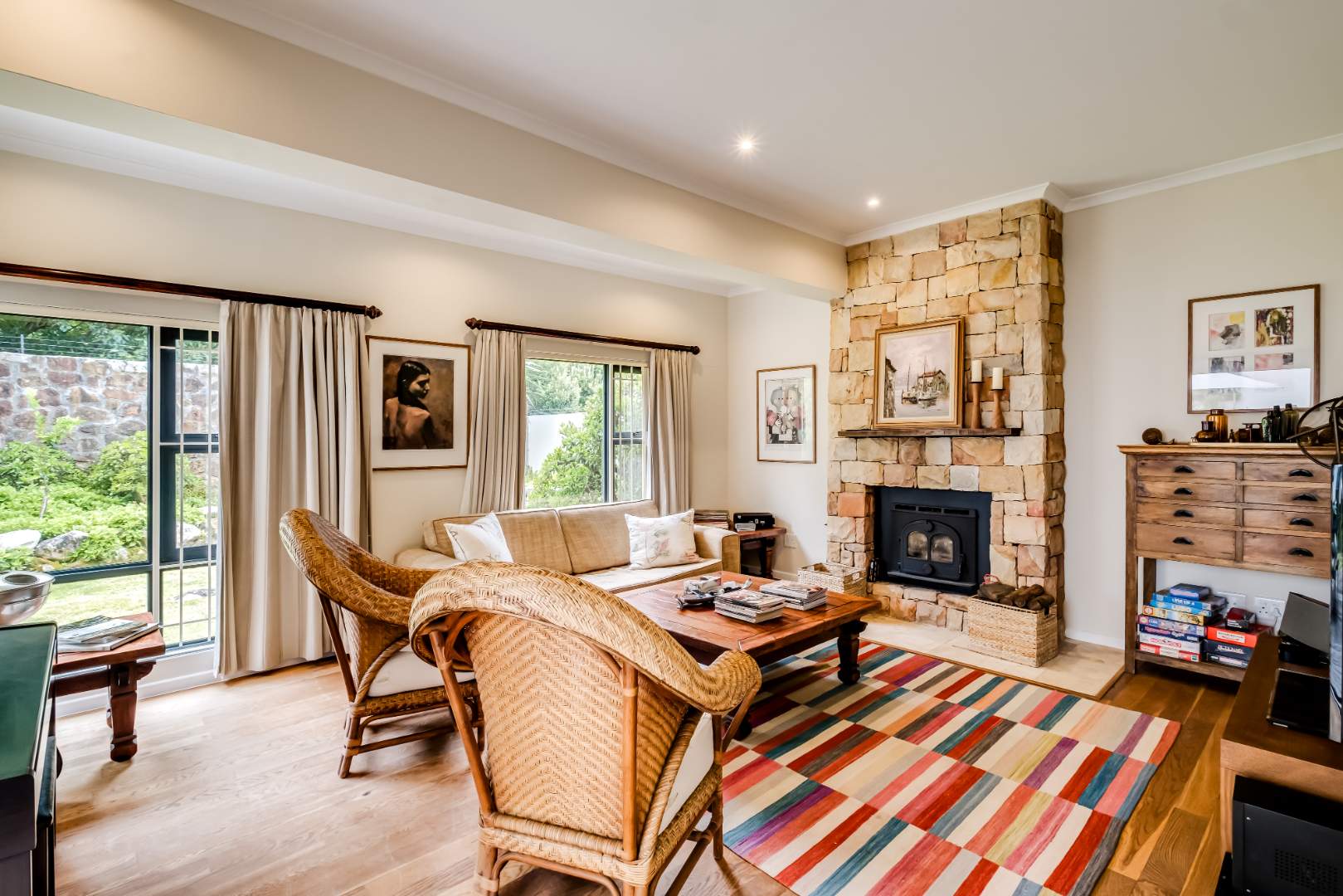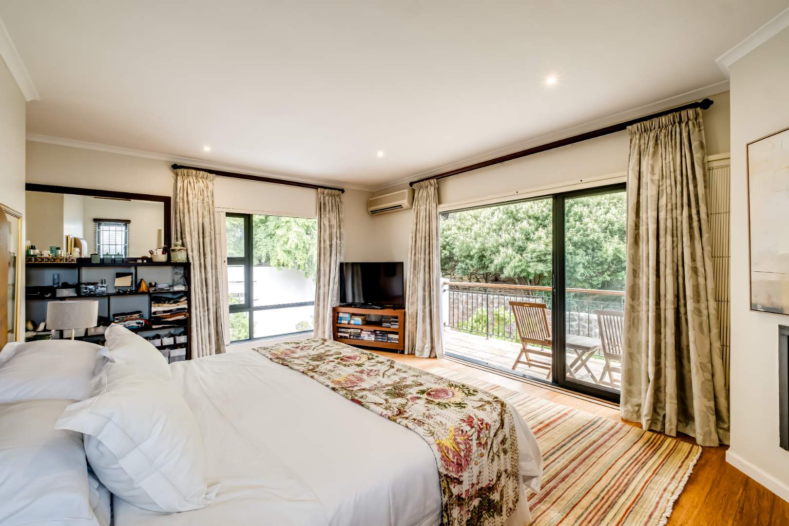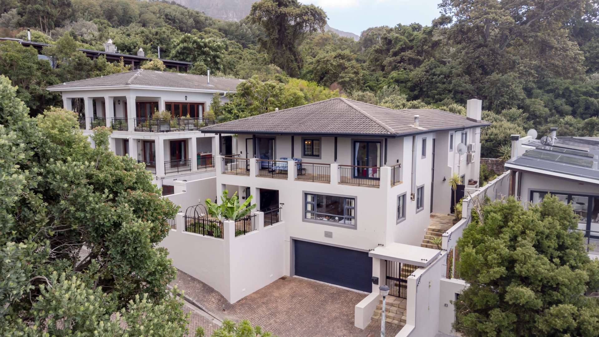 Offering 4 bedrooms all located upstairs together, 2 full bathrooms (main en-suite + a dressing room), a guest cloakroom, 2 lounges accompanied by fireplaces, a dining room inter-leading to an enclosed braai room, open-planned to a fitted kitchen, and lastly a very generously sized study. Each lounge leading out to an entertainment deck or a covered patio, each bedroom leading to a balcony with distinctive outlooks, with a natural, private, manageable, north facing garden bringing the mountainside into your home.