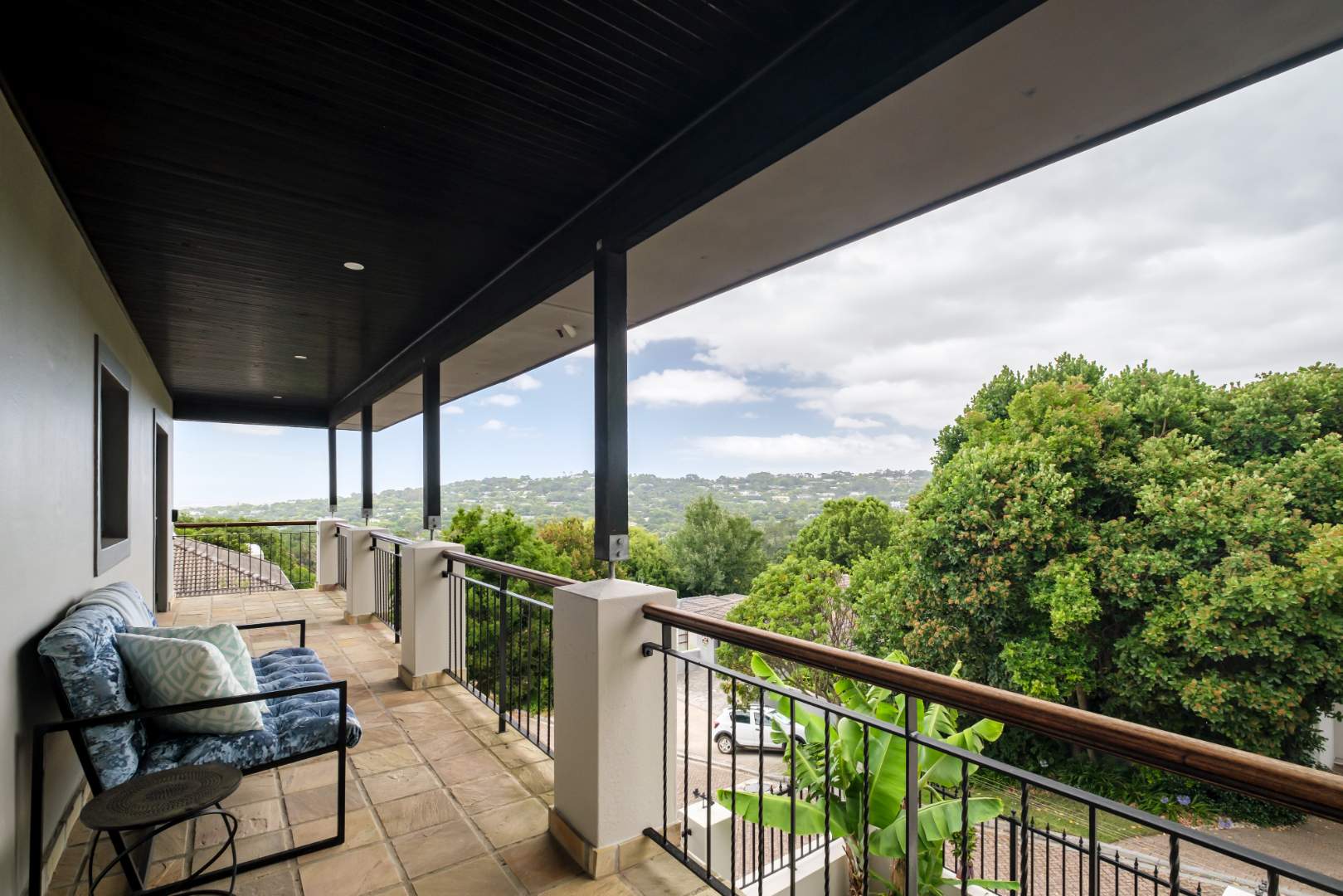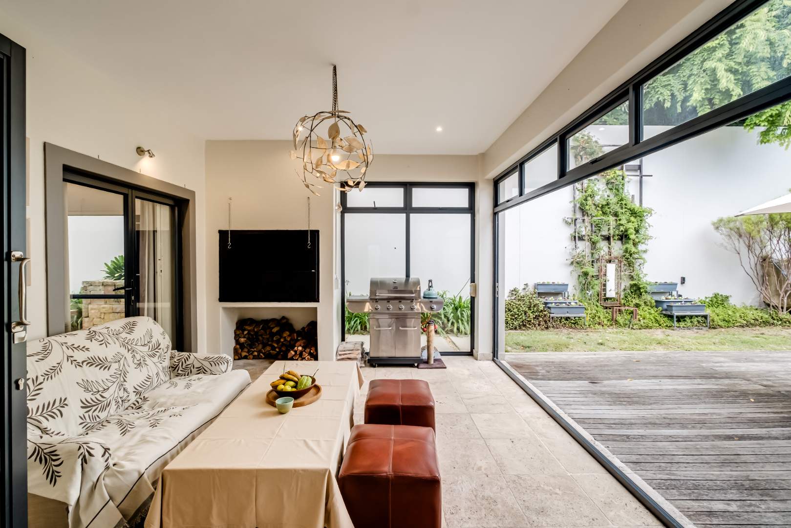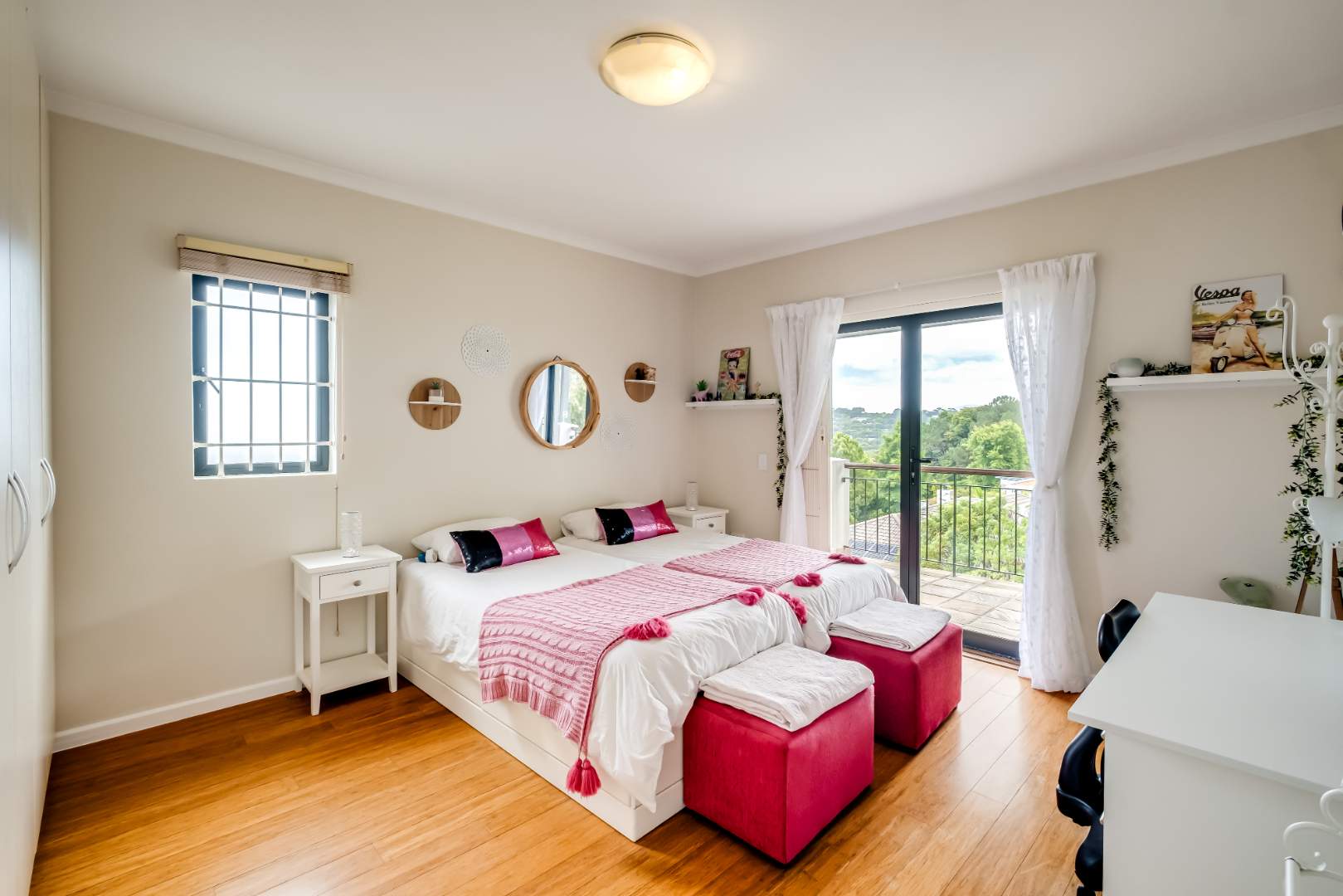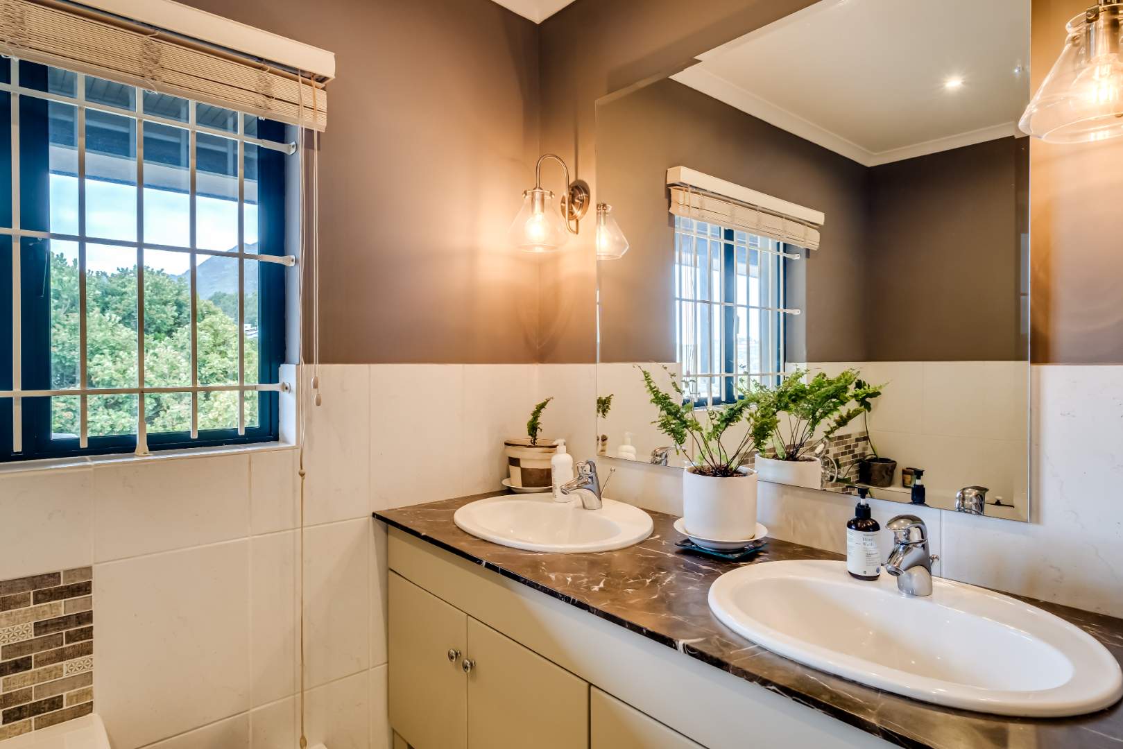 Offering 4 bedrooms all located upstairs together, 2 full bathrooms (main en-suite + a dressing room), a guest cloakroom, 2 lounges accompanied by fireplaces, a dining room inter-leading to an enclosed braai room, open-planned to a fitted kitchen, and lastly a very generously sized study. Each lounge leading out to an entertainment deck or a covered patio, each bedroom leading to a balcony with distinctive outlooks, with a natural, private, manageable, north facing garden bringing the mountainside into your home.