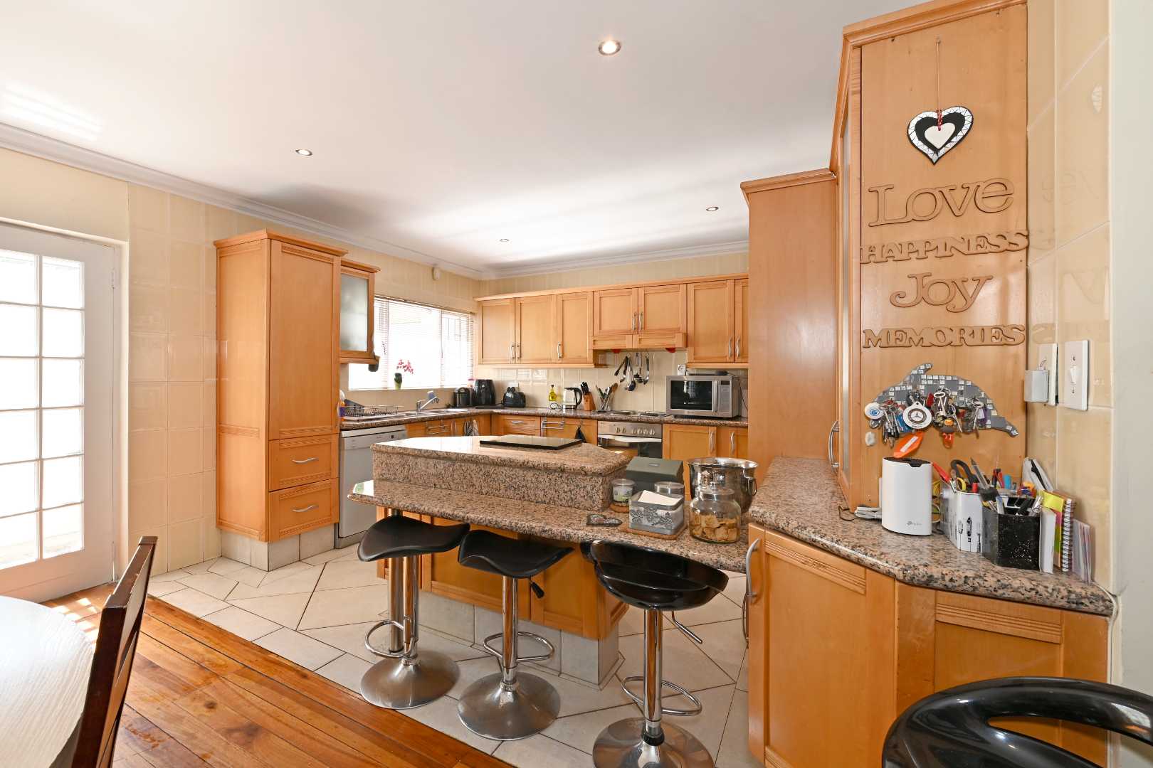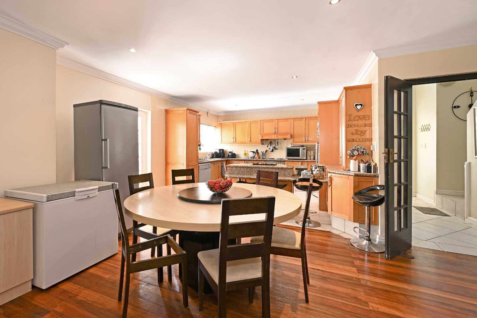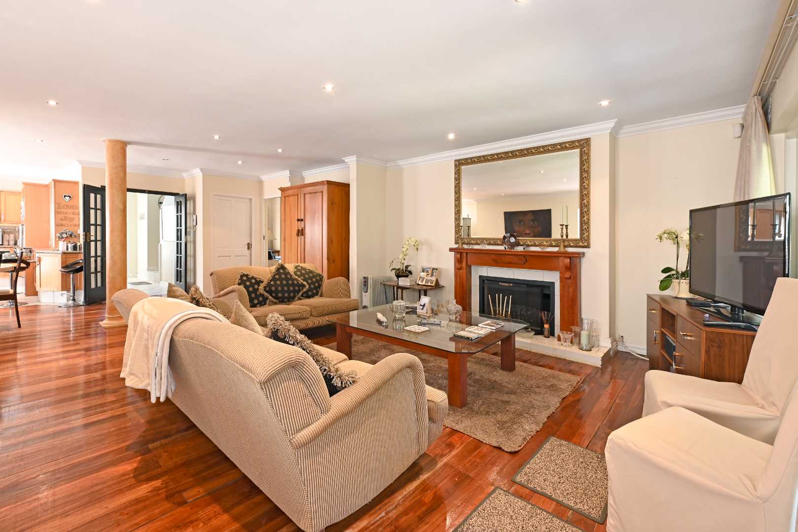 Ground floor living space: Stylish open plan family living with open spaces free flowing from the kitchen to the dining room and lounge, then effortlessly out to the covered patio, private manageable west facing garden and down to the Liesbeek river – a permanent water supply. The wood flooring and gas fireplace complete the picture and keep the warm character we all look for. The tiled kitchen has granite tops, an eat-in centre island, electric stove/ oven/ extractor, double sink, space for a double fridge and a dishwasher.