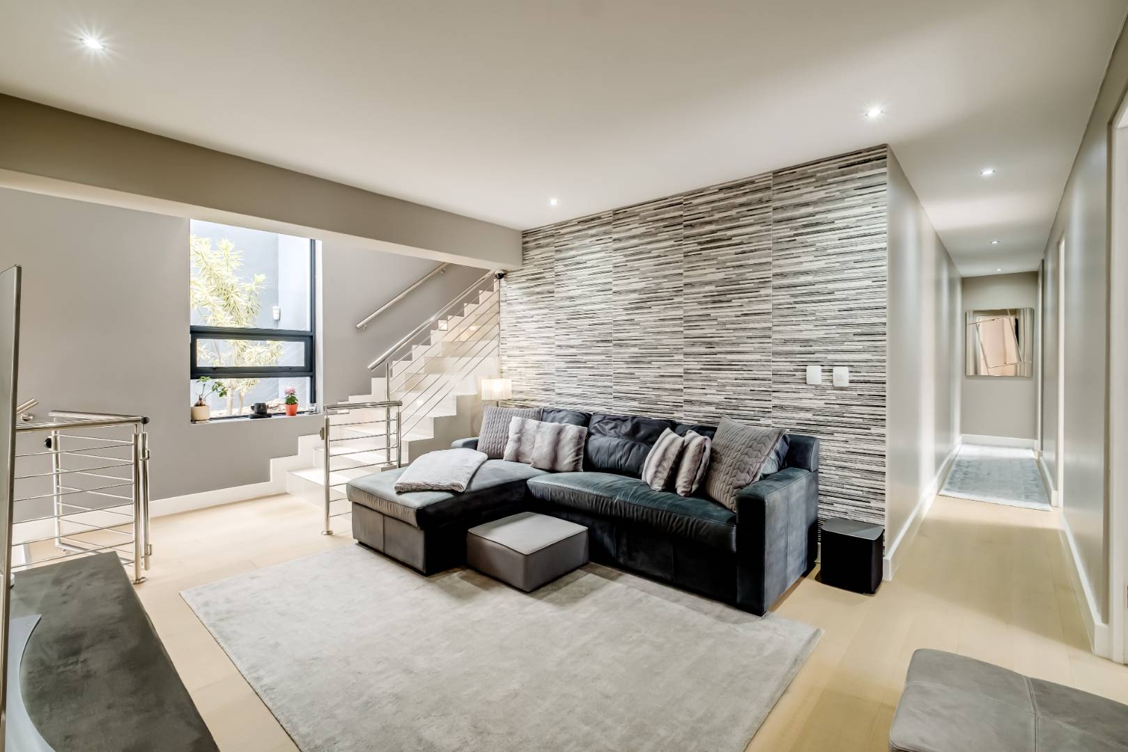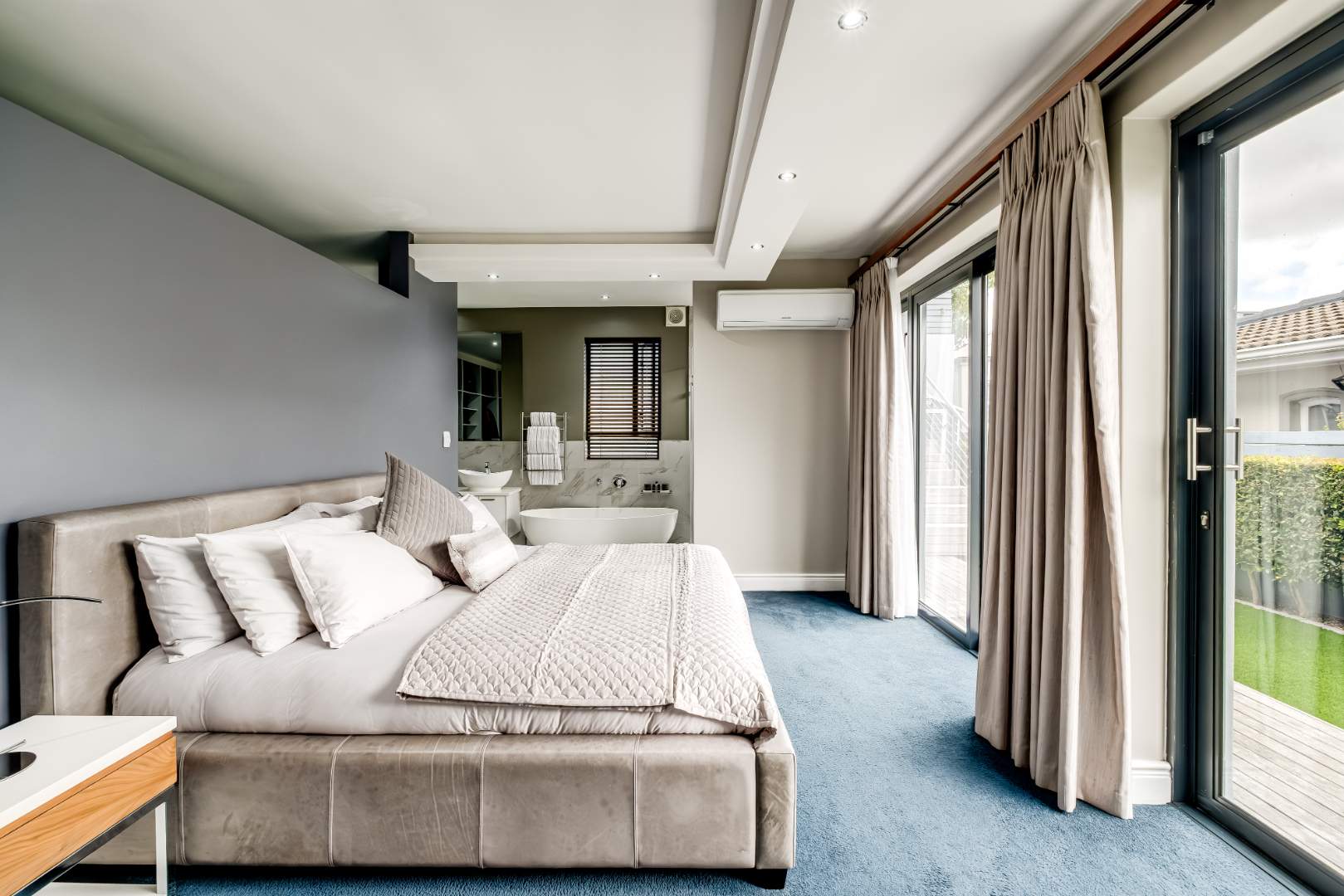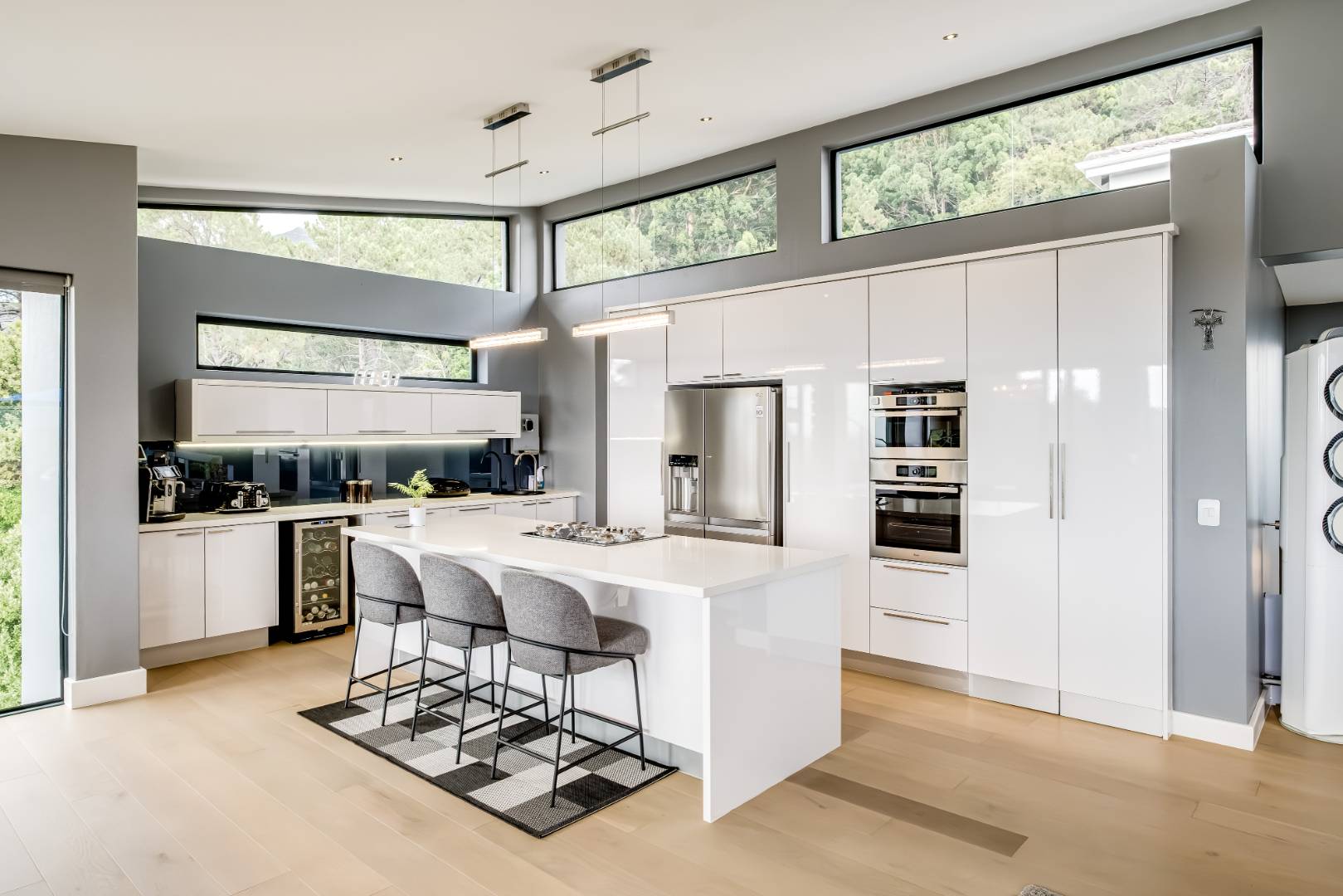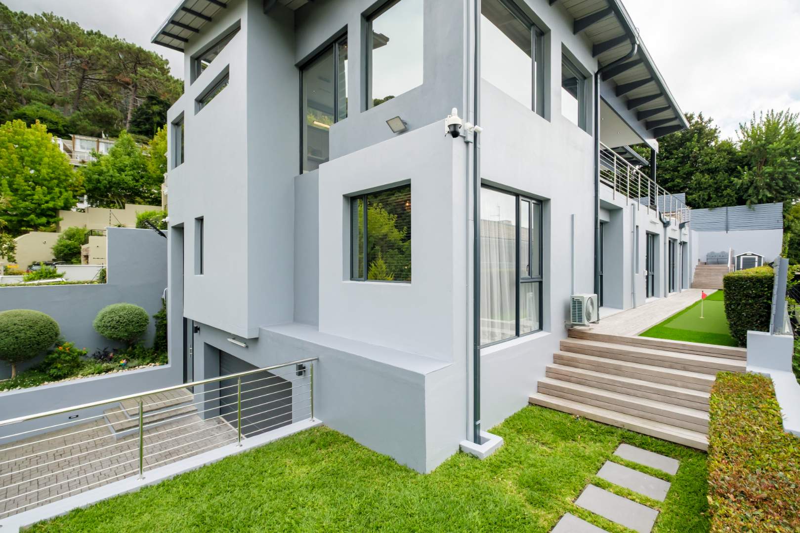 We move on up to the top floor where the real magic happens, showcasing expansive panoramic East views over Bishopscourt Hill stretching endlessly all the way to the Helderberg Mountain Range making starry nights the most magnificent sight. Turn around and face West to our beautiful mountain, the reason Newlands attracts such a large demanding demographic. With stylish open plan entertainment orientated, family living and 360 degree views no matter which way you turn and a large slow burning fireplace, this is your opportunity to dine in exclusive elegance. A fully kitted kitchen consisting of a large centre island with integrated gas stove, walk-in pantry and neatly tucked away scullery/ laundry. The study is placed at top of the staircase and fitted with cabinetry - perfectly suitable for a work from home space.