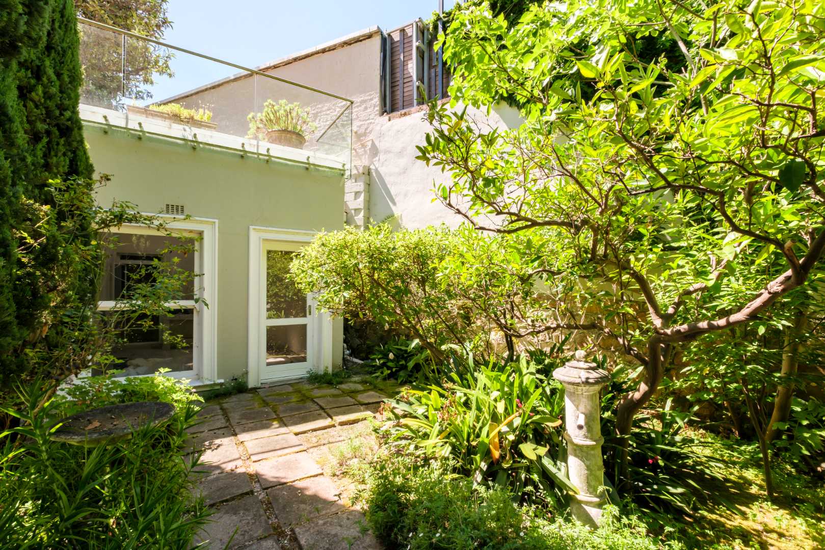 3 bedrooms with laminate flooring, the main with an en-suite (shower/ basin/ toilet) and a Juliette balcony overlooking a private garden and pool. Bedrooms 2 and 3 are serviced by a full family bathroom.